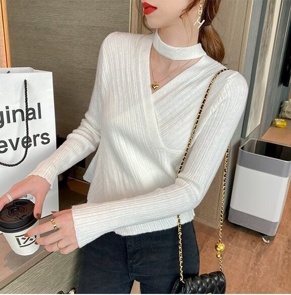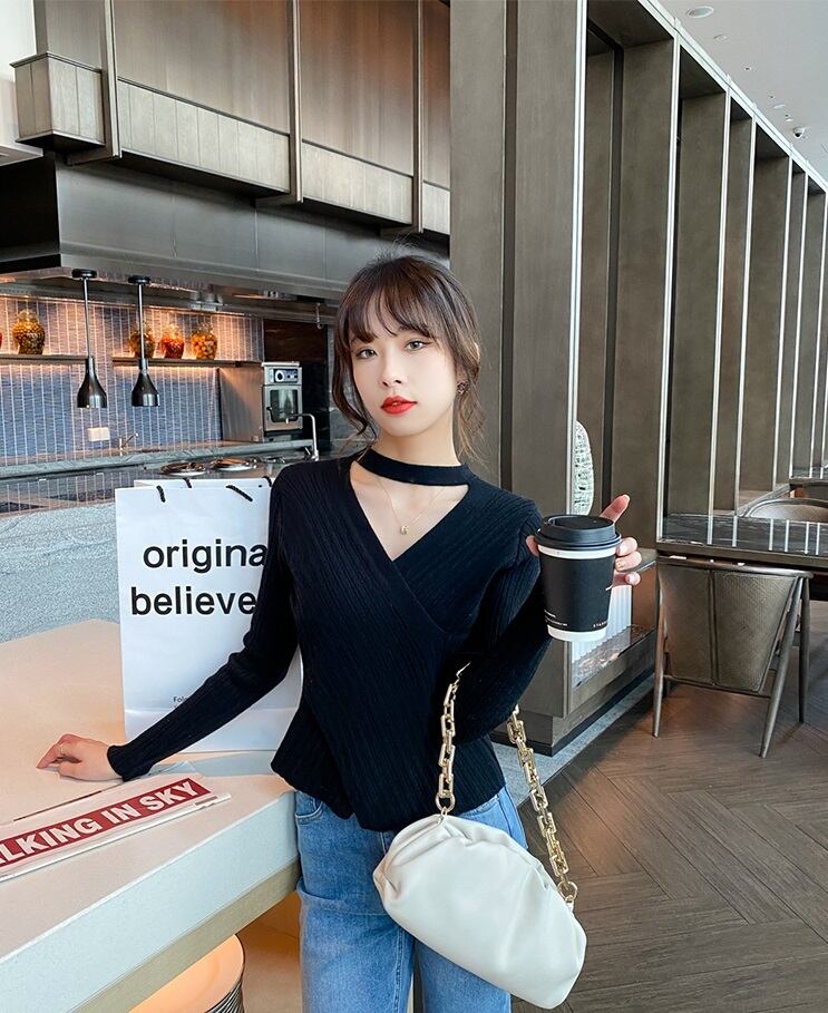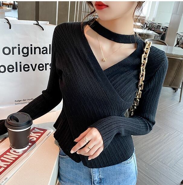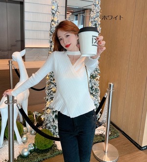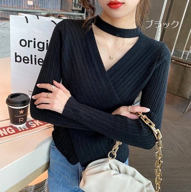 トップス レディース タイト リブニット ブラック ホワイト グレー モカ 4色 フリーサイズ オシャレ Vネック 長袖 チョーカー風ラップリブニット 無地ニット かわいい 大人可愛い きれいめ シンプル カジュアル 大人 上品 秋 冬 10代 20代 30代 40代 オフィス ビジネス OL 通勤 ファッション コーデ スタイル 送料無料
