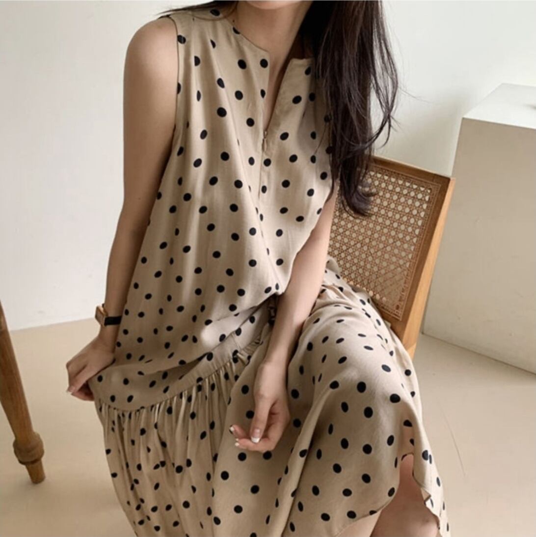 ワンピース レディース 送料無料 フレアワンピース フレア ロングワンピース ロング丈 マキシワンピース マキシ丈 Aライン ノースリーブ 袖なし オープンフロントネック スリットネック 切り替えデザイン 裾フレア ドット柄 水玉模様 カーキ ブラック 大人女子 大人可愛い かわいい フェミニン 涼し 爽やか 上品 エレガント おしゃれ お洒落 こなれ感 抜け感 ラフ カジュアル フリーサイズ ゆったり ゆる 春服 夏服 秋服 重ね着 普段使い おでかけ デート 休日 10代 20代 30代 40代 定番