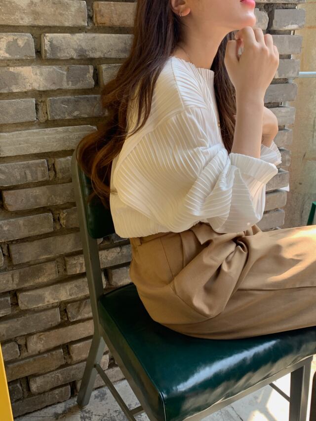 上品なプリーツが大人の女性にピッタリのトップスです。