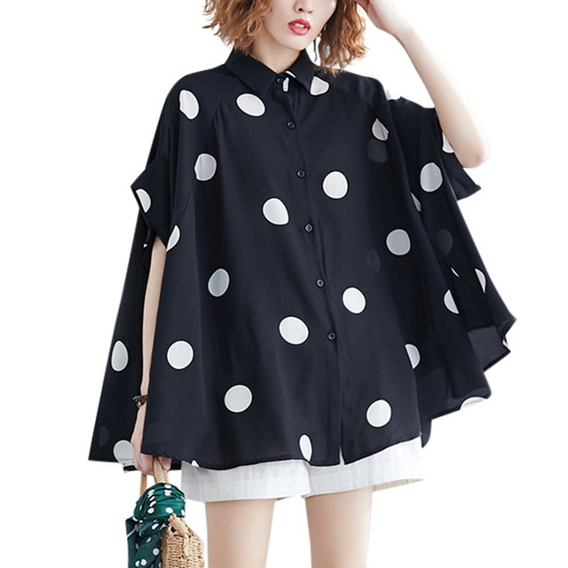 トップス レディース 送料無料 2色 ドットプリントブラウス シフォンブラウス オーバーサイズ ブラウス 半袖 シフォンシャツ 襟付き 水玉 ドット バイカラー おしゃれ スタイル 小顔見せ 着痩せ 体形カバー インスタ トレンド フェミニン きれいめ かわいい シフォン キュート 女子会 オフィス 通勤 OL ルーズ ゆったり ドレープ エレガント フェミニン ブラック ホワイト モノトーン こなれ感 ボリューム シンプル ロマンチック ナチュラル ガーリー ふんわり デート お出かけ