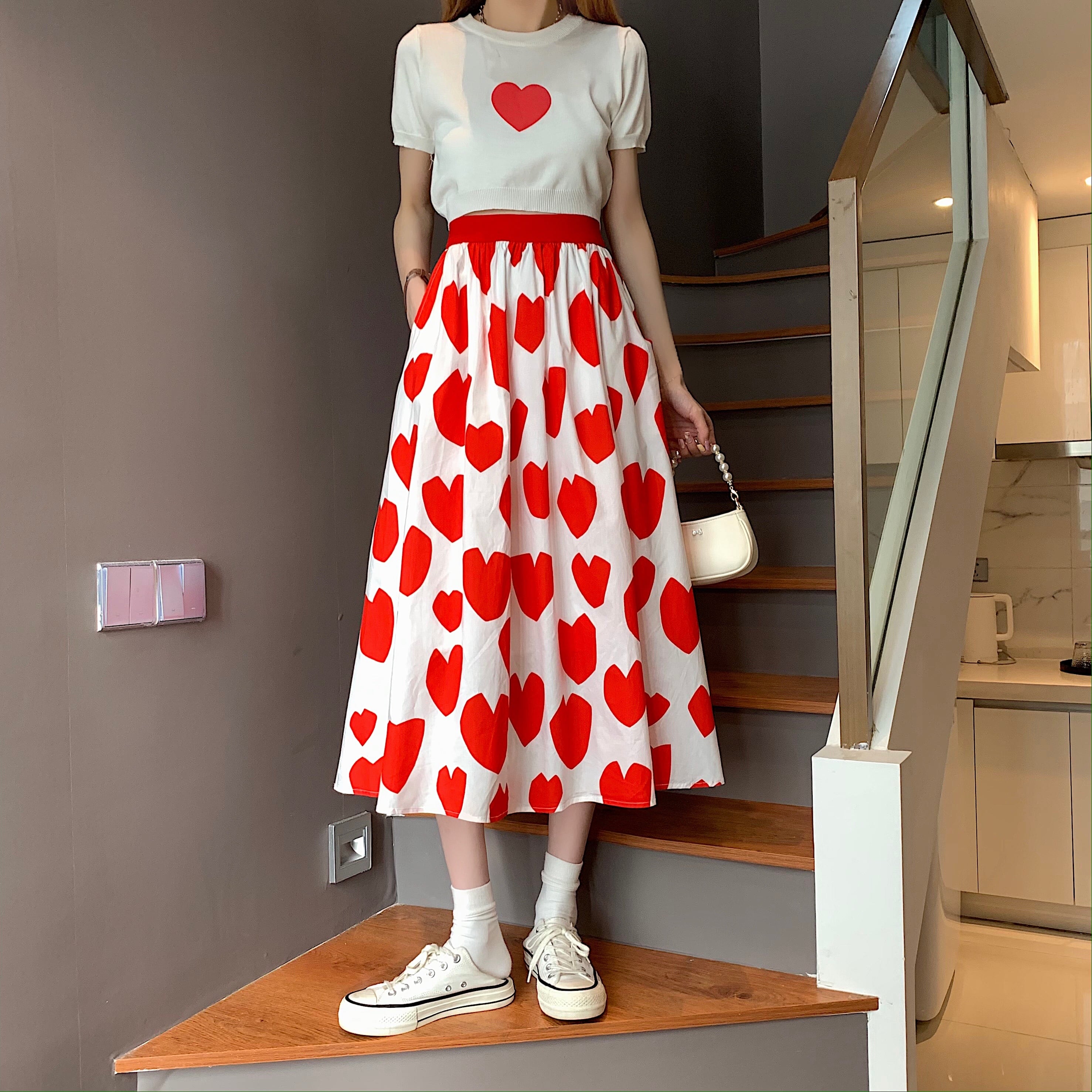 ハート柄がたくさんで遊び心いっぱいのキュートなフレアスカート。