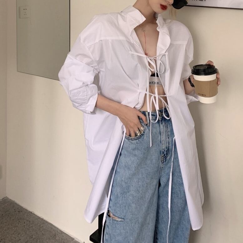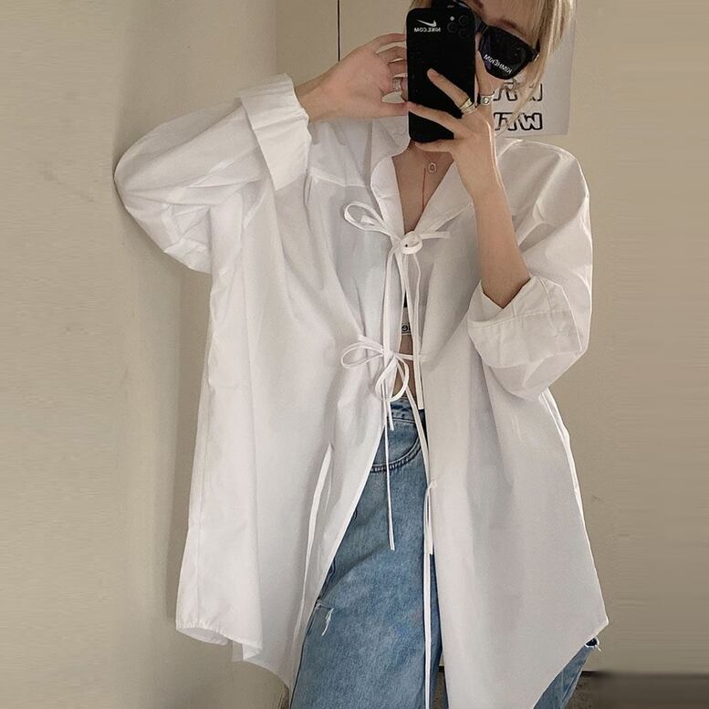 トリプルリボンシャツ レディース 送料無料 前後2wayブラウス バックコンシャスシャツ チュニック丈シャツ バックリボンスモックブラウス リボン付き2wayバックリボンフレアブラウス トップス 白シャツ 白トップス ロング 長袖 襟付き ワイド オーバーサイズ ビッグシルエット リボン バックリボン バックシャン バックコンシャス 大人可愛い きれいめ キュート ガーリー ゆったり 白 ホワイト 重ね着 楽ちん 体型カバー 高見え 格上げ インスタ映え 春夏 おしゃれ 普段使い デイリー お出かけ
