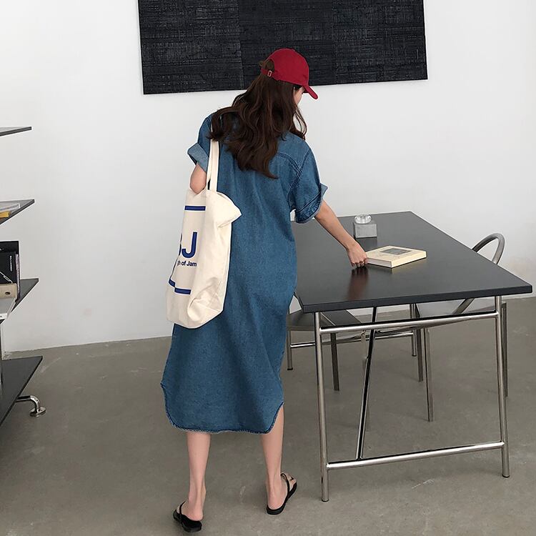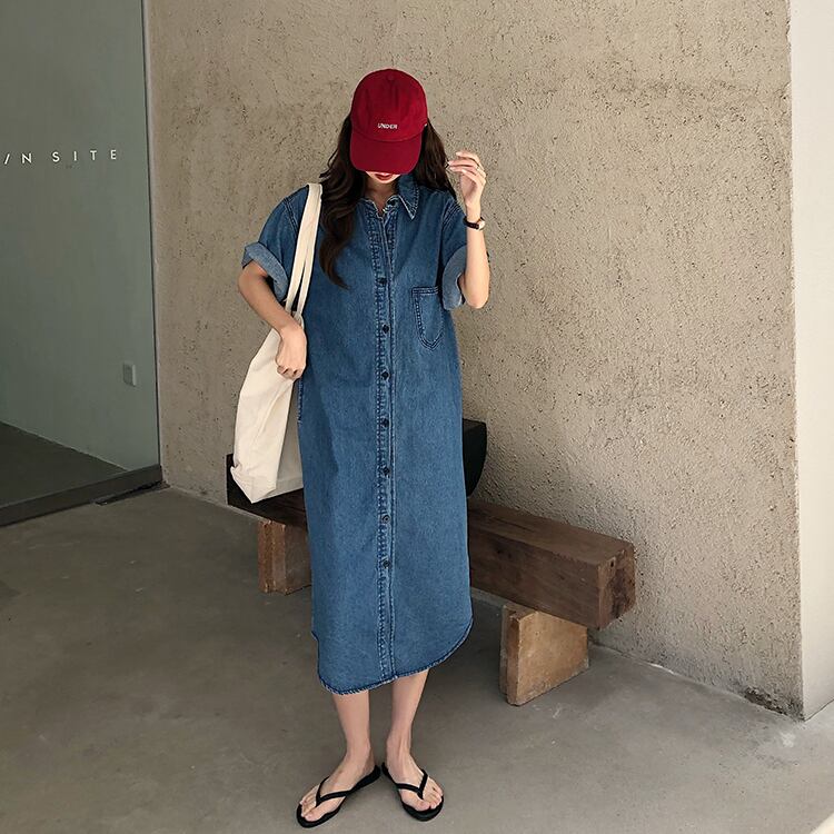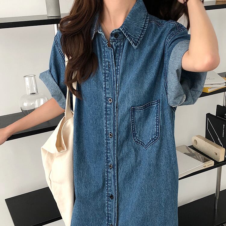 ワンピース レディース ロング丈 デニム調 デニム 半袖ワンピース 半袖 無地 10代 20代 30代 40代 春 夏 お出かけ デート お泊り おしゃれ 無地ワンピース ロールアップ S M L 大人可愛い きれいめ シンプル カジュアル 大人 上品 休日 公園デビュー ランチ 普段着 通学 楽ちん スタイル 送料無料