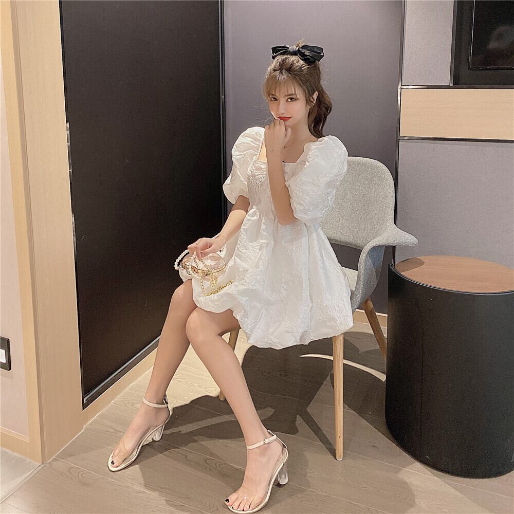 袖とスカートをふんわりしあげてスクエアネックですっきりした印象に。