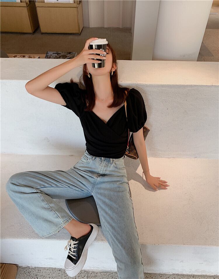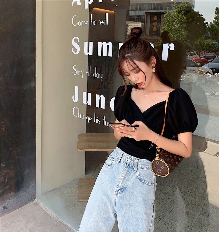トップス レディース Tシャツ ショート ショート丈 袖あり 半袖 スリム タイト 細身 パフスリーブ ハートシェイプドネック かわいい 大人可愛い きれいめ シンプル カジュアル クロップド丈 半袖ピチTシャツ 無地Tシャツ スタイリッシュ シック ブラック S M L XL 無地 春 10代 夏 20代 学生 通学 デート お出かけ 女子会 お泊まり 休日 運動 ジム ヨガ アウトドア リゾート 旅行 海 プール スタイル 楽ちん 送料無料