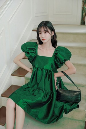 袖とスカートをふんわりしあげてスクエアネックですっきりした印象に。