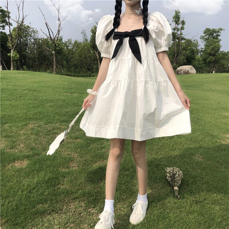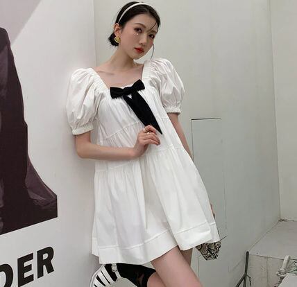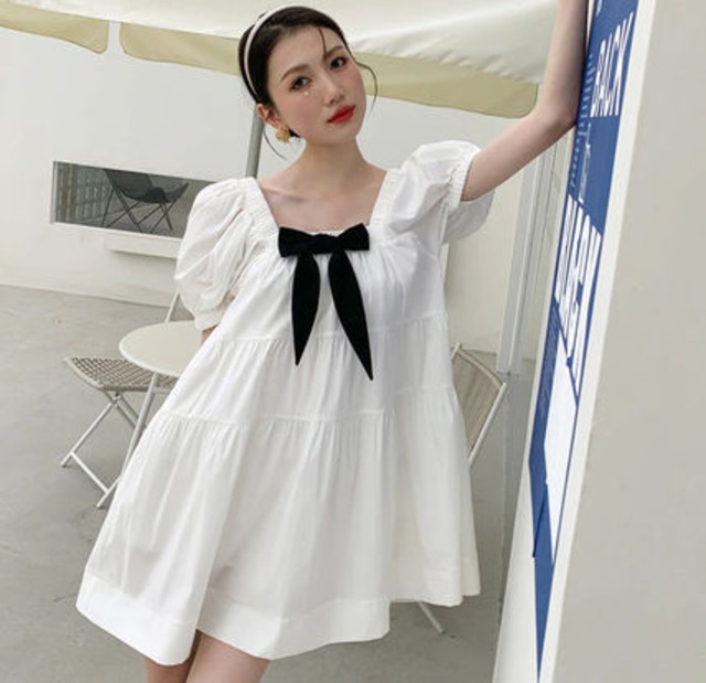 袖とスカートはふんわりと、スクエアネックですっきりした印象に。