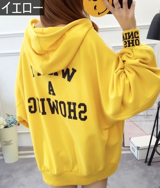トップス レディース 送料無料 6色展開 パーカー プルオーバー ブラック 黒色 イエロー 黄色 ホワイト 白色 レッド 赤色 オレンジ グリーン 緑色 バックプリント ロゴ 英字 フロントポケット フード付き オーバーシルエット ビッグシルエット オーバーサイズ 大きめ ゆったり ゆる 楽ちん 彼シャツ風 ワイド ブカブカ 長袖 ボリューム袖 ランタンスリーブ カジュアル ラフ おしゃれ お洒落 カッコイイ かっこいい こなれ感 マニッシュ ルーズ 春服 秋服 冬服 普段使い 着回し 重ね着 おでかけ