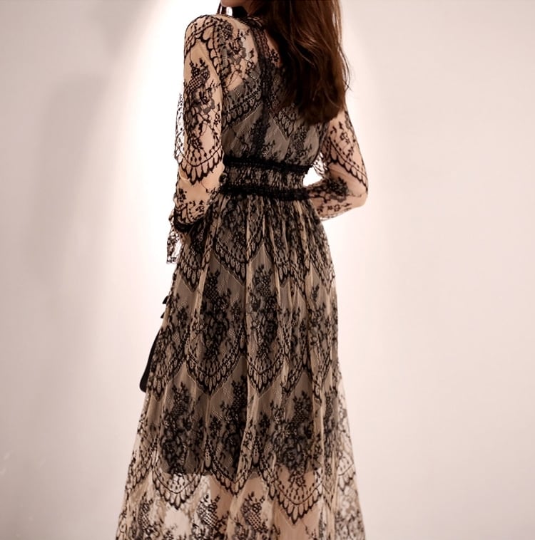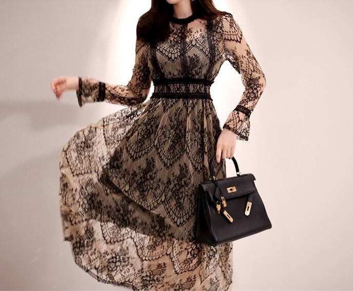 ワンピース レディース 送料無料 総レース フレアワンピース ロングワンピース ロング丈 ミモレ丈 クルーネック ハイネック ファスナー 花柄 ハイウエスト 細見え ウエストマーク 花柄 長袖 サーキュラーカフス フェミニン リュクス 大人可愛い 上品 エレガント 抜け感 こなれ感 お洒落 おしゃれ 大人女子 エキゾチック お呼ばれドレス パーティードレス パーティー衣装 謝恩会 二次会 披露宴 特別な日 ブラック 黒色 春服 夏服 秋服 重ね着 パーティー イベント 20代 30代 S M L XL