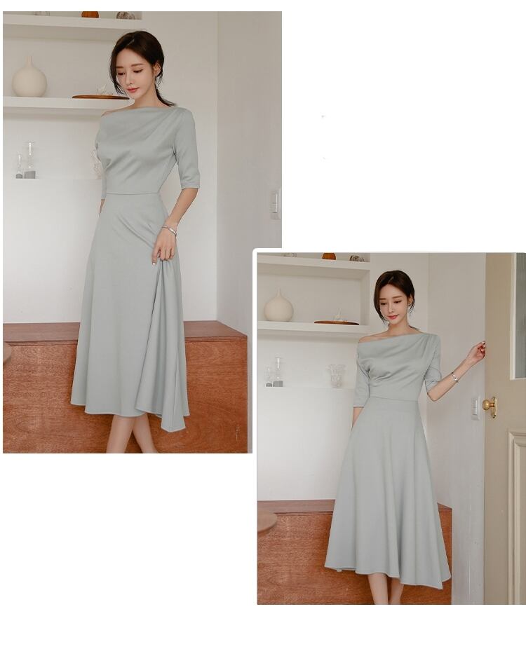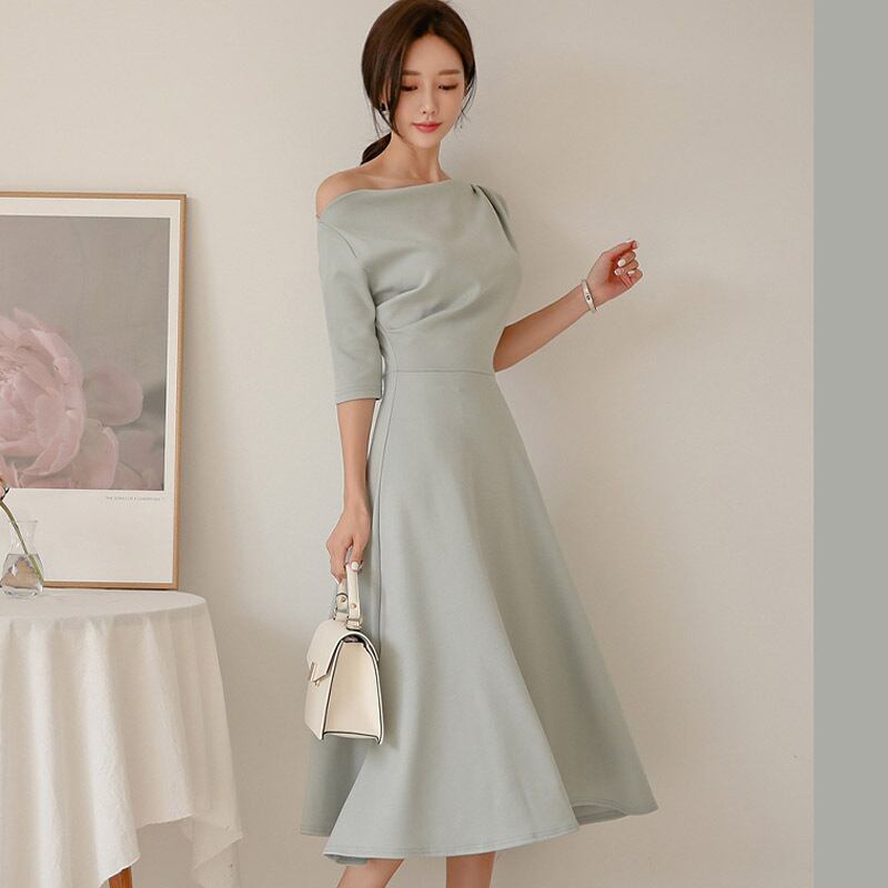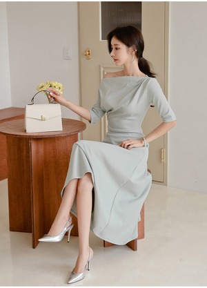 ワンピース レディース 送料無料 フレアワンピース フレア ロング丈 ロングワンピース ミモレ丈 アシメネック アシンメトリー 半袖 五分袖 5分袖 ハイウエスト 切り替えデザイン プルオーバー 体型カバー 脚長 細見え 二の腕カバー デコルテ スタイルアップ スリム ミントグリーン S M L XL 大人可愛い きれいめ 清楚 清潔感 大人女子 フェミニン 上品 エレガント こなれ感 抜け感 無地 シンプル 春服 夏服 20代 30代 オフィス OL 通勤 おでかけ デート 普段使い モテ 2021