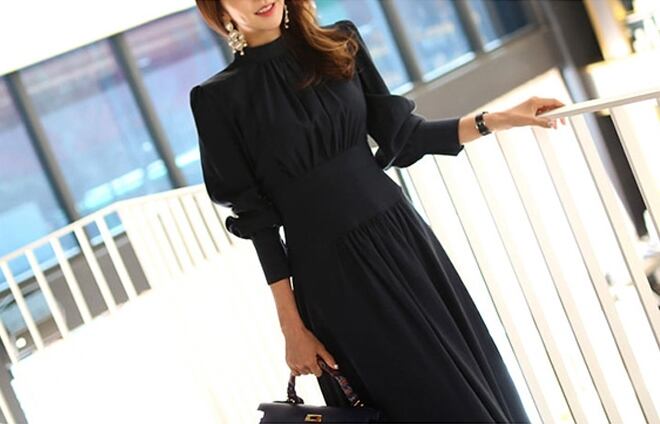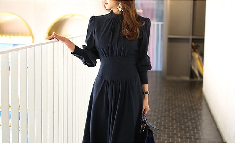 ワンピース レディース 送料無料 フレアワンピース フレア ロング丈 ロングワンピース ミモレ丈 立ち襟 スタンドカラー ハイネック クルーネック タック 長袖 ロングスリーブ パフスリーブ ボリューム袖 パワーショルダー オーバーショルダー ハイウエスト ウエストマーク 体型カバー 二の腕カバー 脚長 細見え スリム フィット感 スタイルアップ ネイビー 紺色 きれいめ 上品 エレガント こなれ感 大人女子 大人可愛い 清楚 清潔感 おしゃれ お洒落 シンプル 春服 秋服 20代 30代 40代 新作