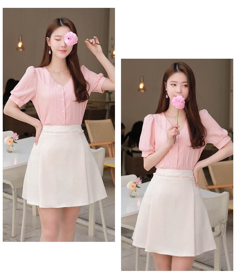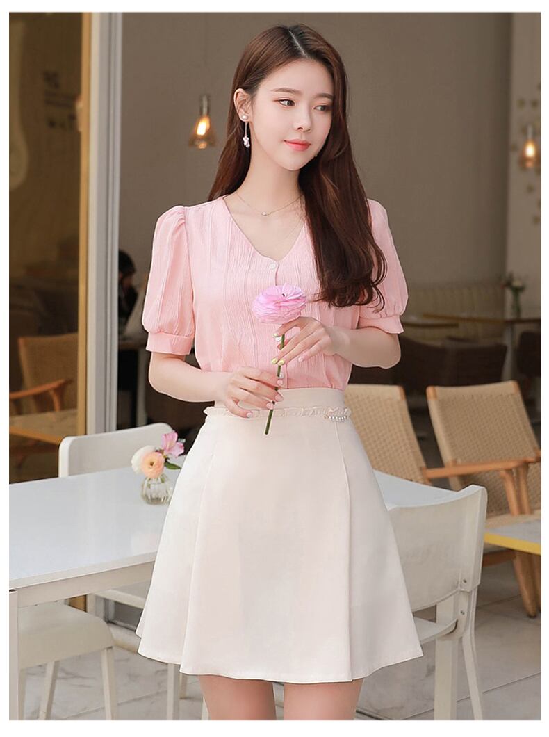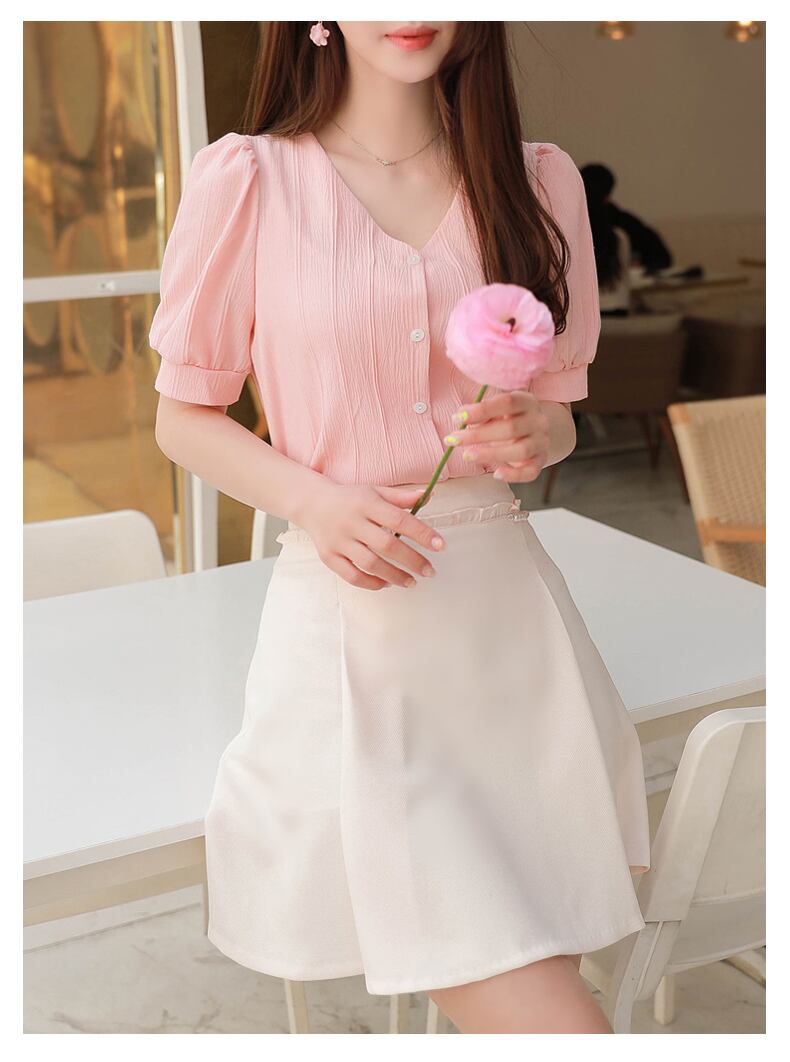 トップス レディース パフスリーブブラウス パフ袖 Vネック パフ袖 ブラウス ピンク ボタンブラウス 上品 S M L XL 2XL 上品 ブラウス お出かけ デート 大人可愛い ビジネスシーン 通勤 通学 オフィス 休日 旅行 Vネックブラウス 春 夏 半袖 10代 20代 30代 女子会 無地 きれいめ 送料無料