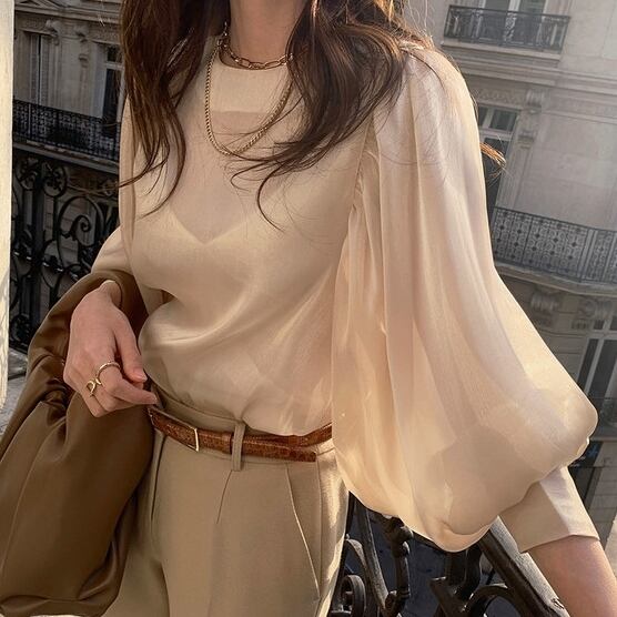 上品なツヤが大人っぽい透け感のあるシアープラウスです。