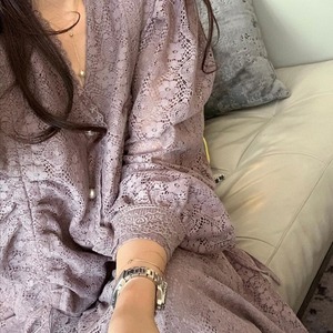 シアーな総レースブラウスとフリルテープで切り替えたティアードスカートのセットアップ