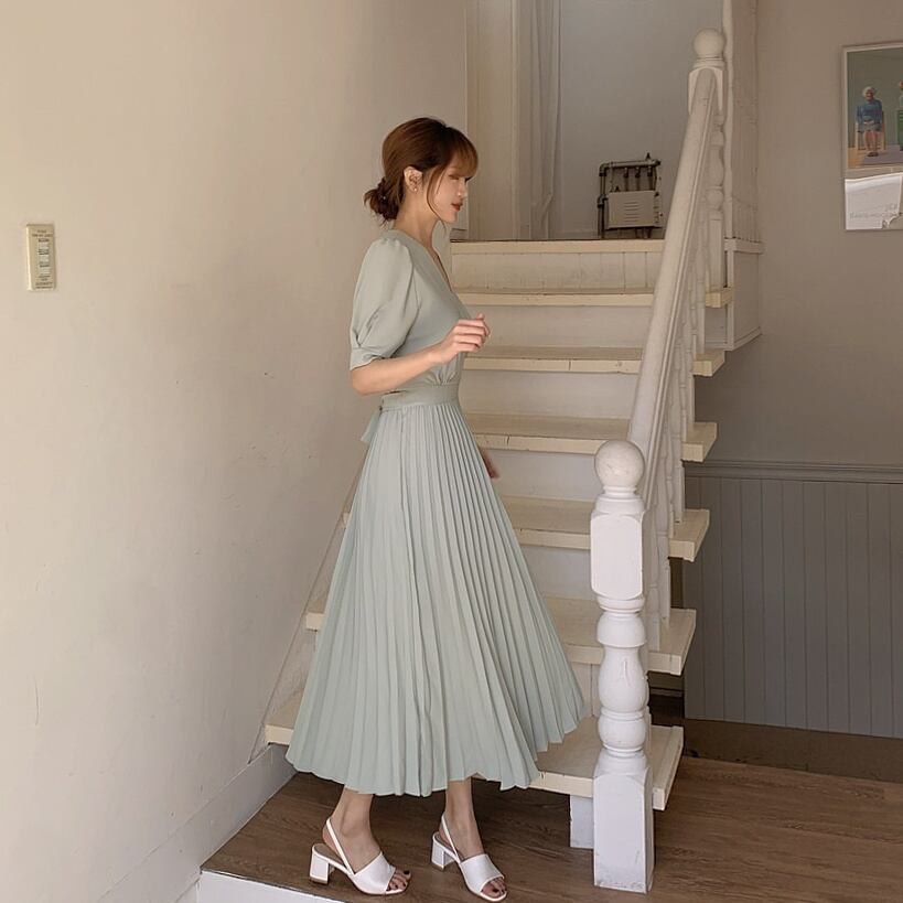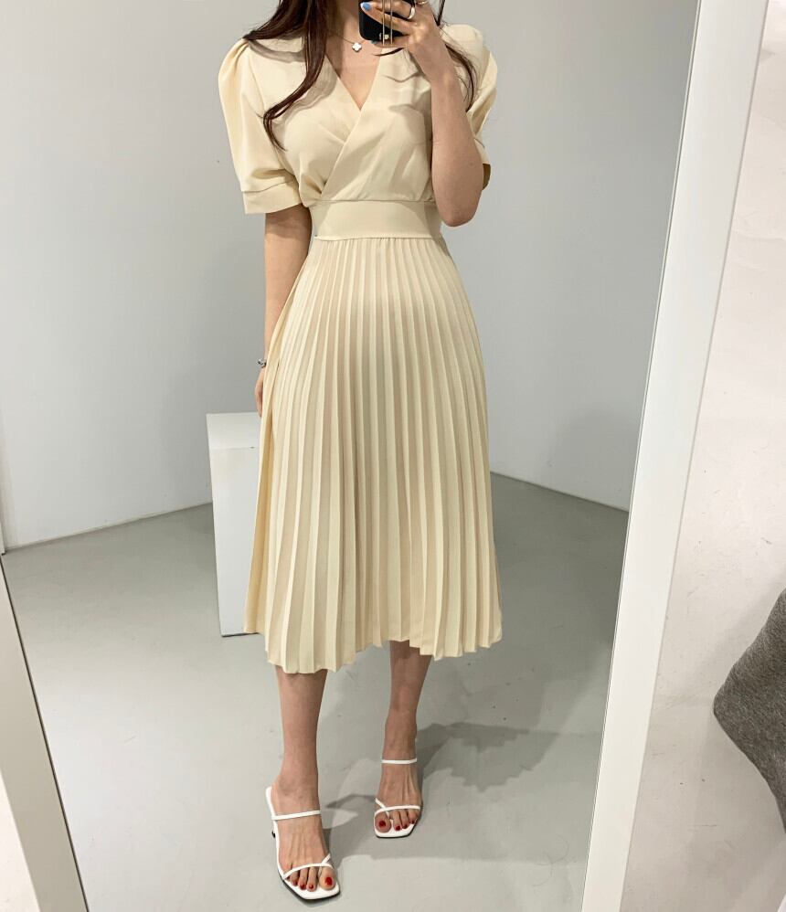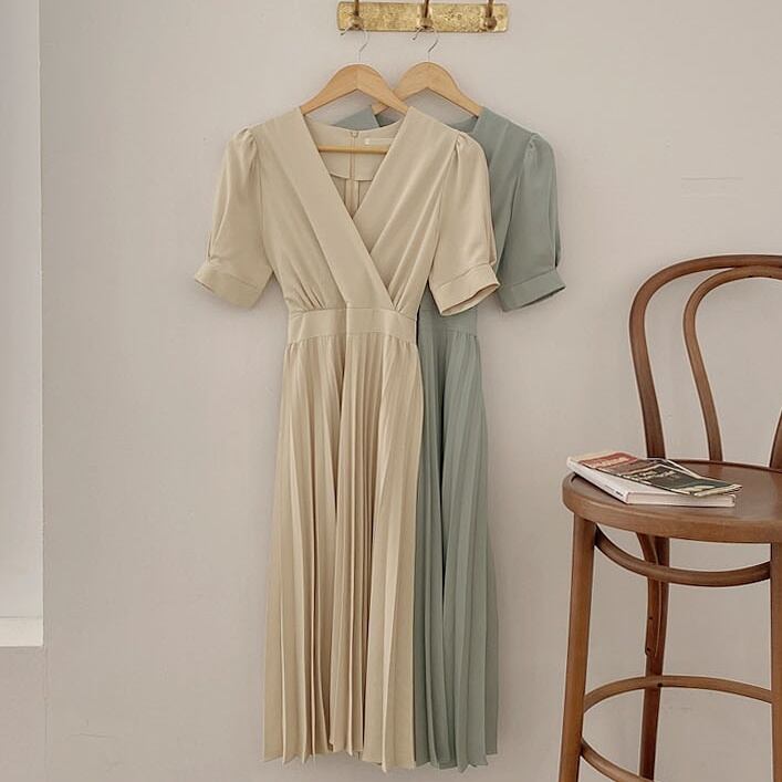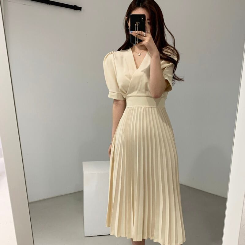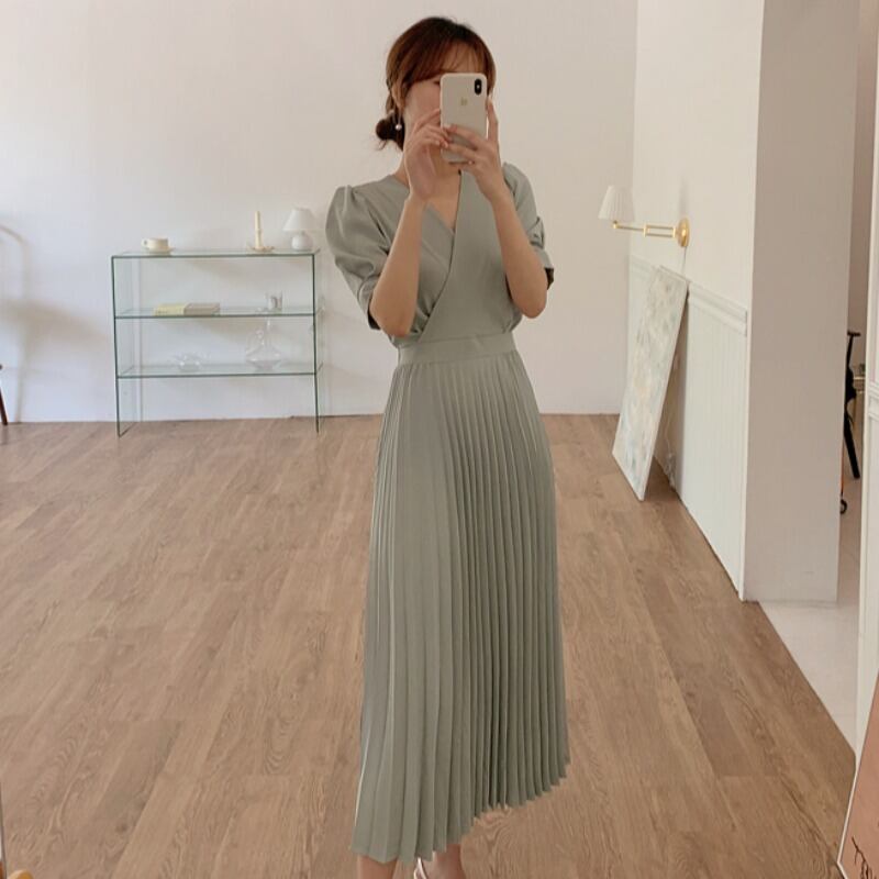 ワンピース レディース 送料無料 2色 カシュクールワンピース プリーツワンピース フレアワンピース 半袖 パフスリーブ ハイウエスト ミモレ丈 Vネック プリーツ リラックス グリーン クリーム おしゃれ ロマンチック ガーリー キュート かわいい こなれ感 スタイル 小顔見せ 着痩せ 体形カバー インスタ トレンド きれいめ エレガント ギャザー シャーリング フレア 大人かわいい 上品 リゾート 旅行 シフォン ドール お人形 ふんわり パフスリーブ デート お出かけ カジュアルドレス
