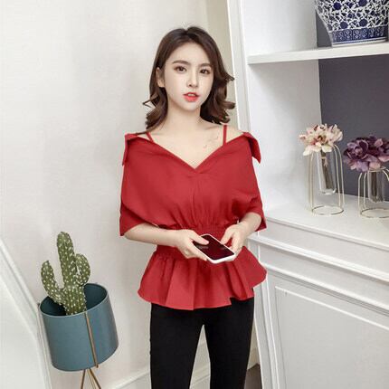 オフショルダーの下にキャミソールをレイヤードしたようなシャツです。
