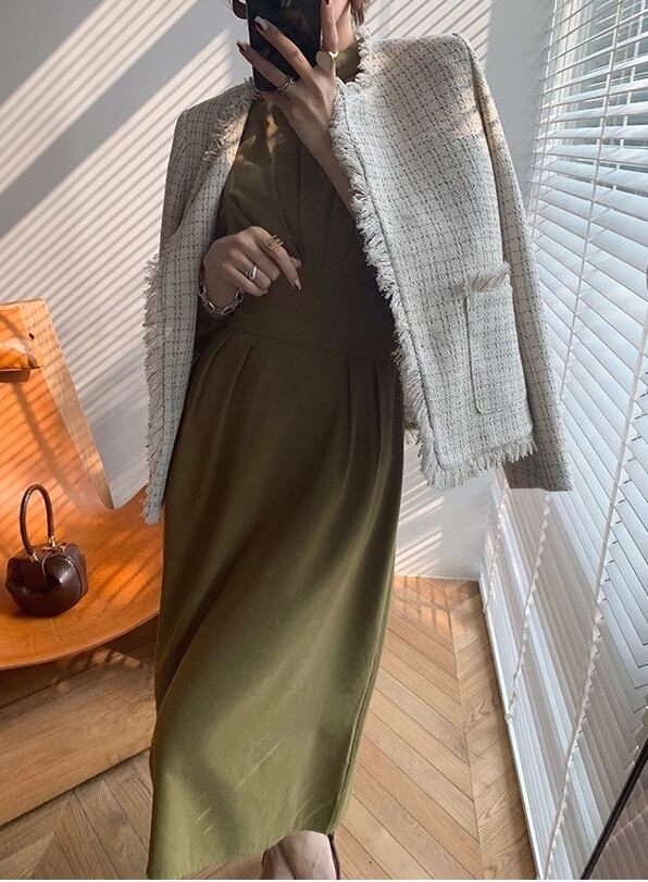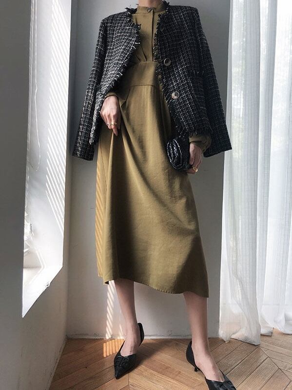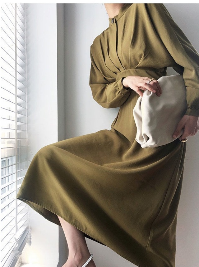 パーティードレス ワンピース 袖あり ボリューム袖 フレア 膝下 ミモレ ミモレ丈 フレア 襟付き スタンドカラー きれいめ シンプル 大人 上品 おしゃれ お洒落 かっこいい 大人女子 こなれ感 クール モード系 セクシー エレガント モダン カーキ 無地 春 秋 冬 20代 30代 40代 50代 レディース OL 通勤 デート お出かけ パーティー イベント 韓国 韓国系 オルチャン ファッション コーデ モテ