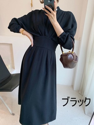 スタンドカラーとボリューム袖がクラシックな印象のワンピース。