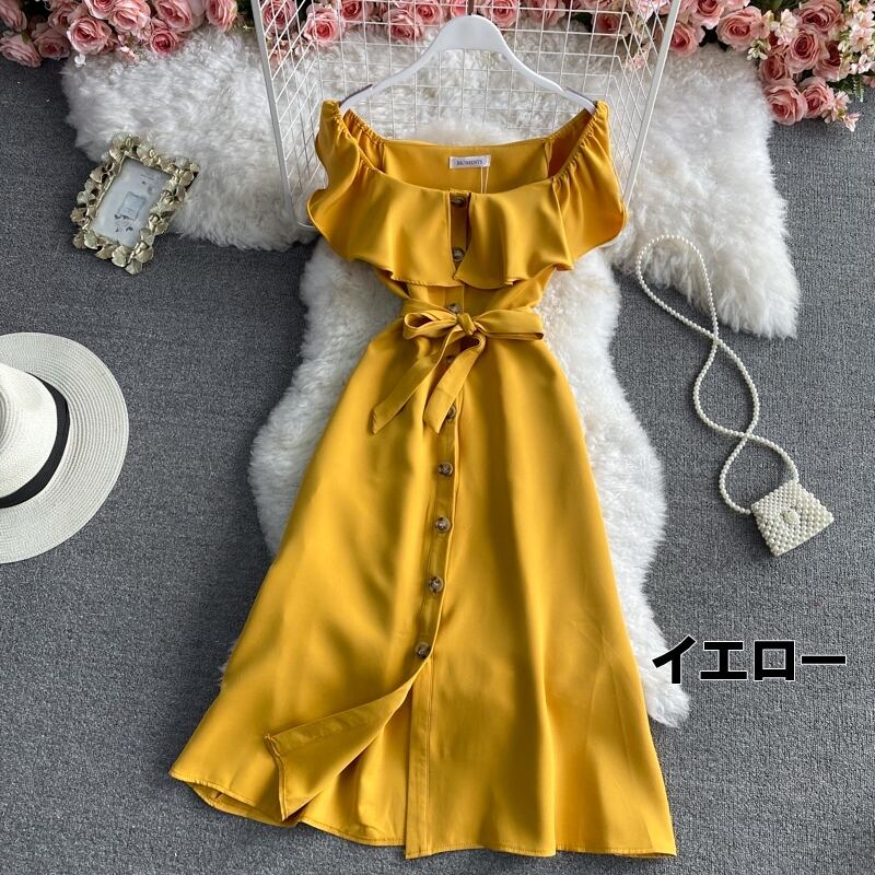 ワンピース レディース 送料無料 5色 オフショルダー フレアスカート ミディアム丈 ミニワンピース ウエストリボン べっ甲ボタン イエロー ブラウン デコルテ 長袖 パフスリーブ ランタンスリーブ バブルスリーブ バルーンスリーブ ボリューム袖 パワーショルダー オーバーショルダー ハイウエスト ウエストマーク ミニスカート 体型カバー 二の腕カバー 脚長 華奢見え 大人可愛い セクシー かわいい お洒落 おしゃれ カッコイイ かっこいい こなれ感 抜け感 春服 夏服 20代 普段使い デート