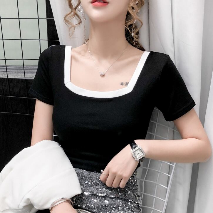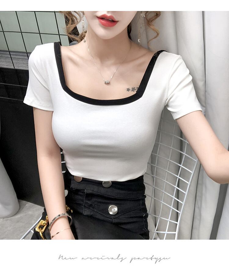 トップス レディース ニット 2色 スクエアネック トラペースネック バイカラー 半袖 配色 メロウ カーディガン バイカラー ショート丈 クロップ丈 半袖 大人可愛い きれいめ シンプル カジュアルM L XL 2XL ホワイト ブラック 夏 20代 30代 オフィス ビジネス OL 通勤 普段使い 韓国 ファッション 薄手 送料無料