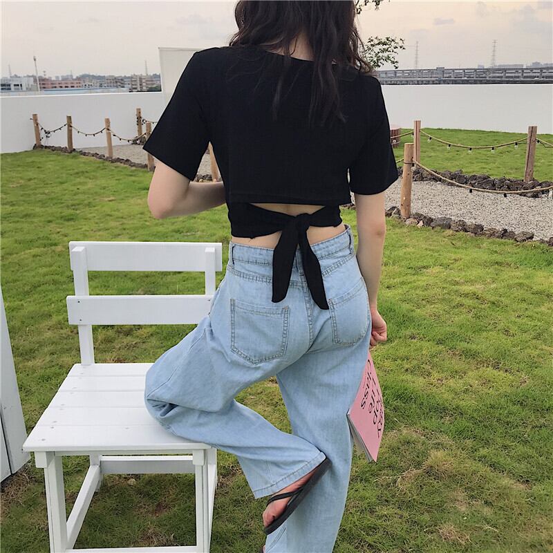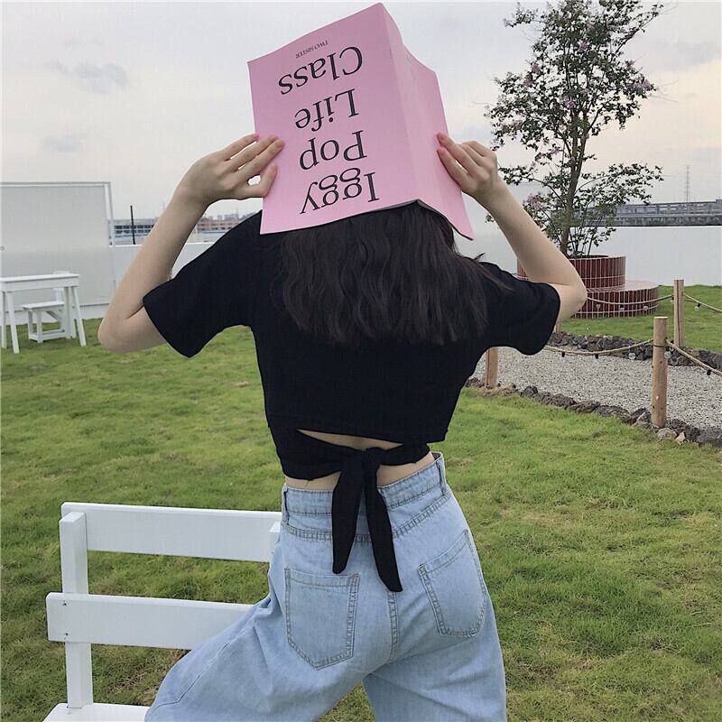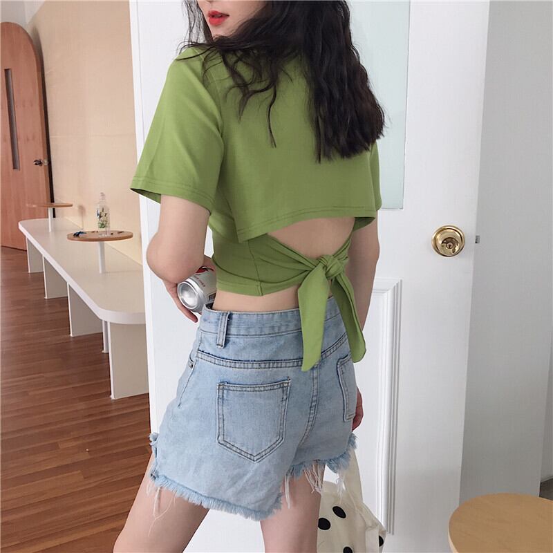 トップス レディース 送料無料 ブラック グリーン 2色 M L XL サイズ3展開 オシャレ 大人 スリム タイト セクシー 背中みせ 海 プール パーティ 10代 20代 30代 夏 お出かけ 日常 デイリー デート 通学 通勤 ランチ 女子会 お泊り 公園デビュー 半袖Tシャツ きれいめ バックリボン クロップド丈Tシャツ 半そでTシャツ 無地Tシャツ クロップド丈Tシャツ スリムTシャツ スパンTシャツ バックリボン
