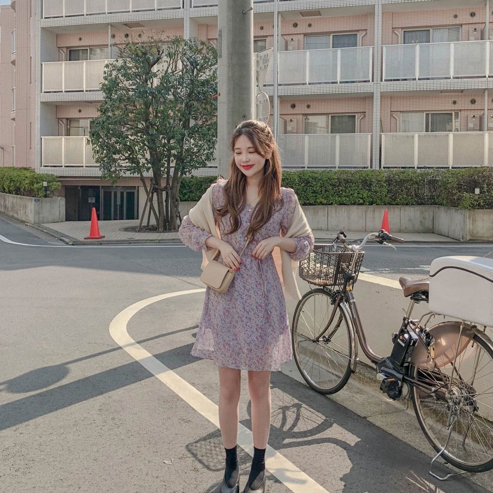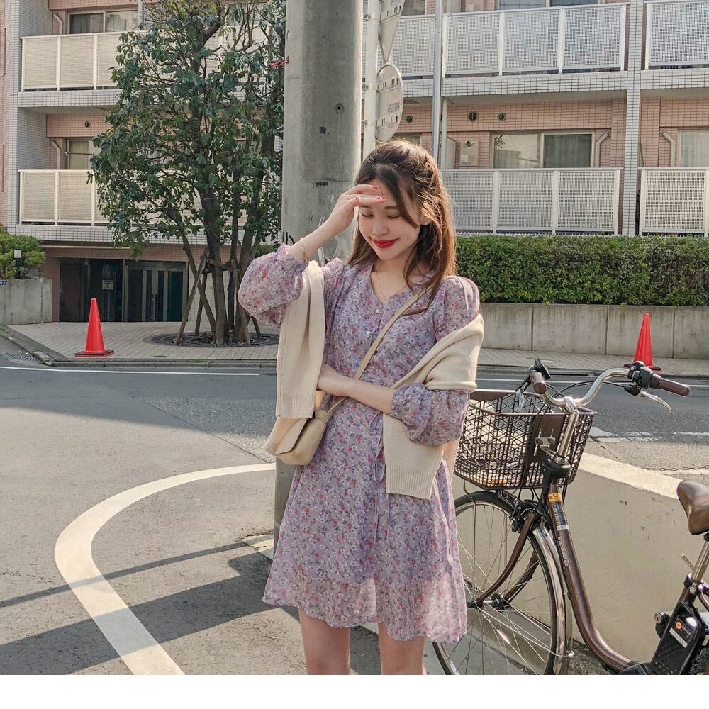 淡い花柄生地でフェミニンに仕立てたミニワンピース。