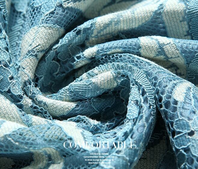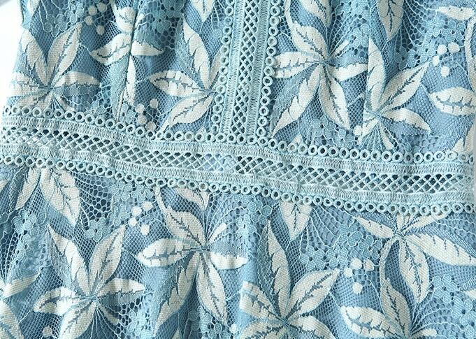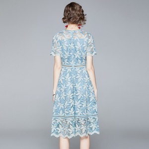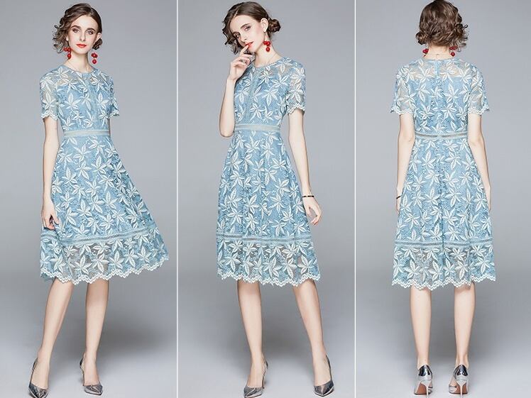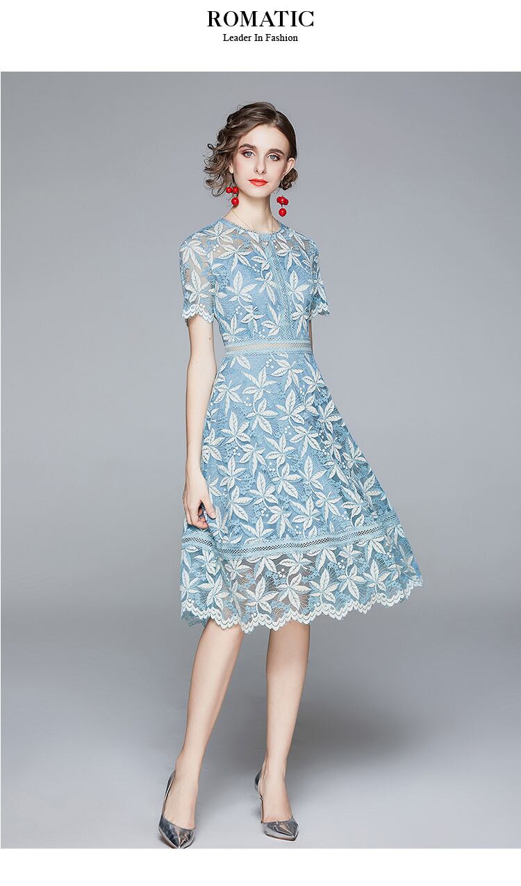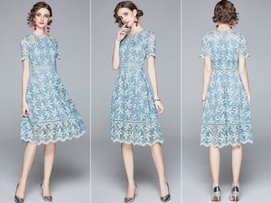 爽やかなパステルブルーにブルーのフラワーレースが清楚な印象のワンピースです。