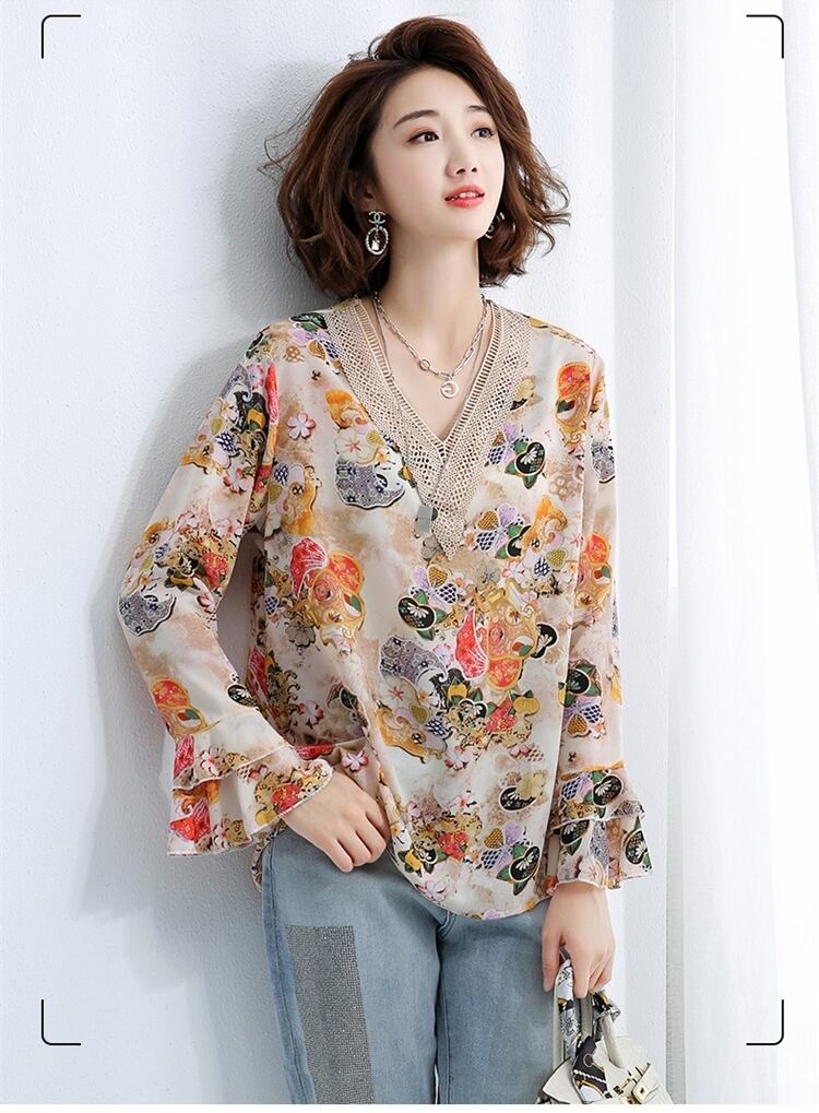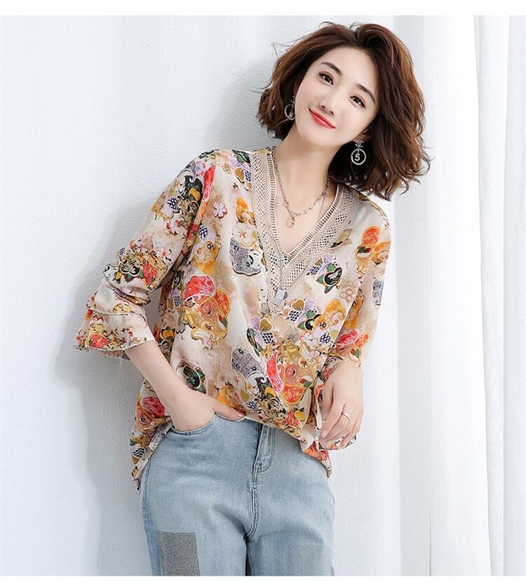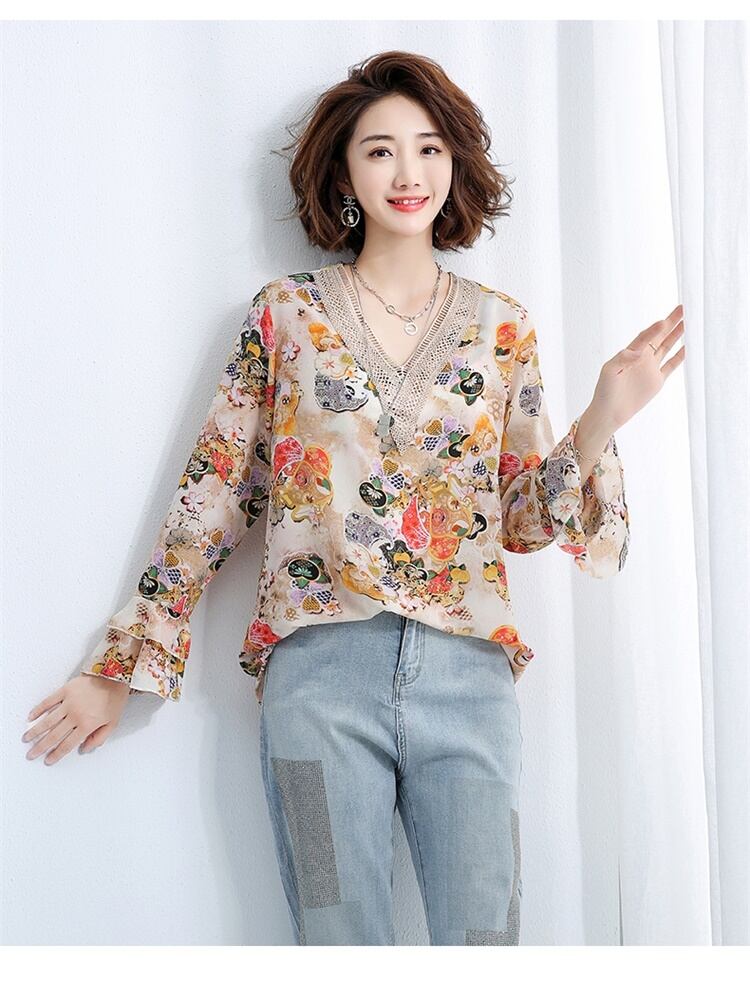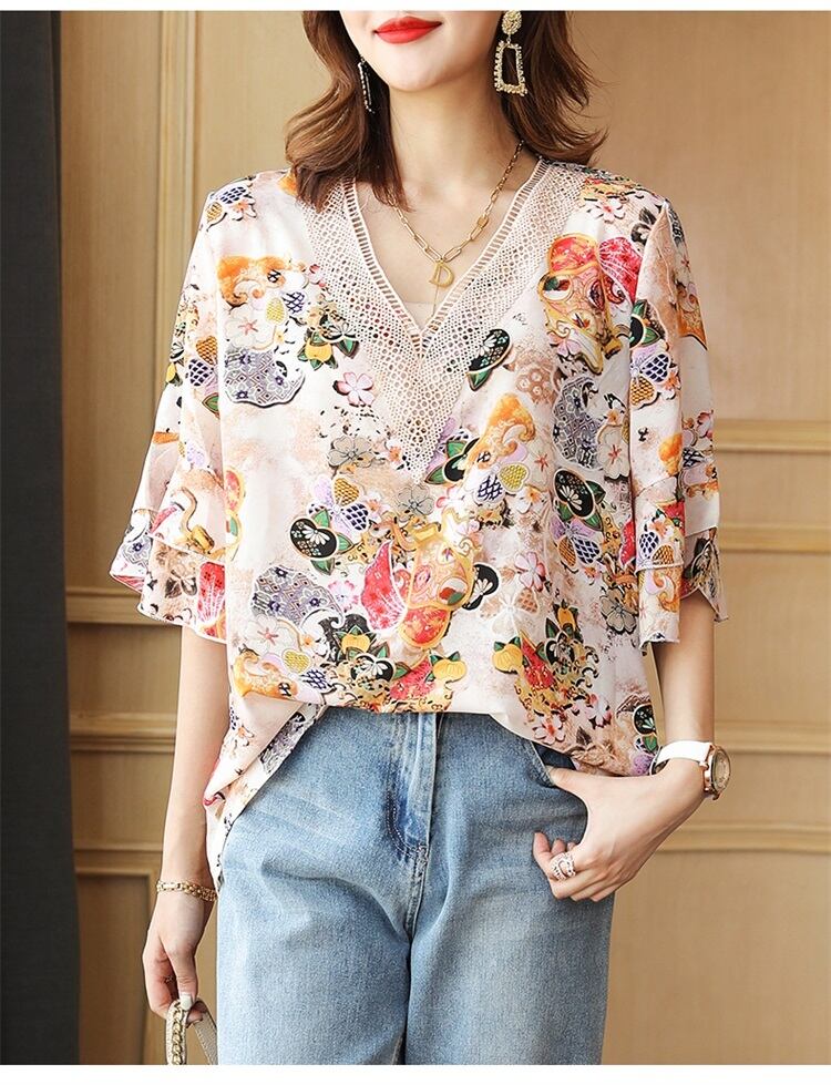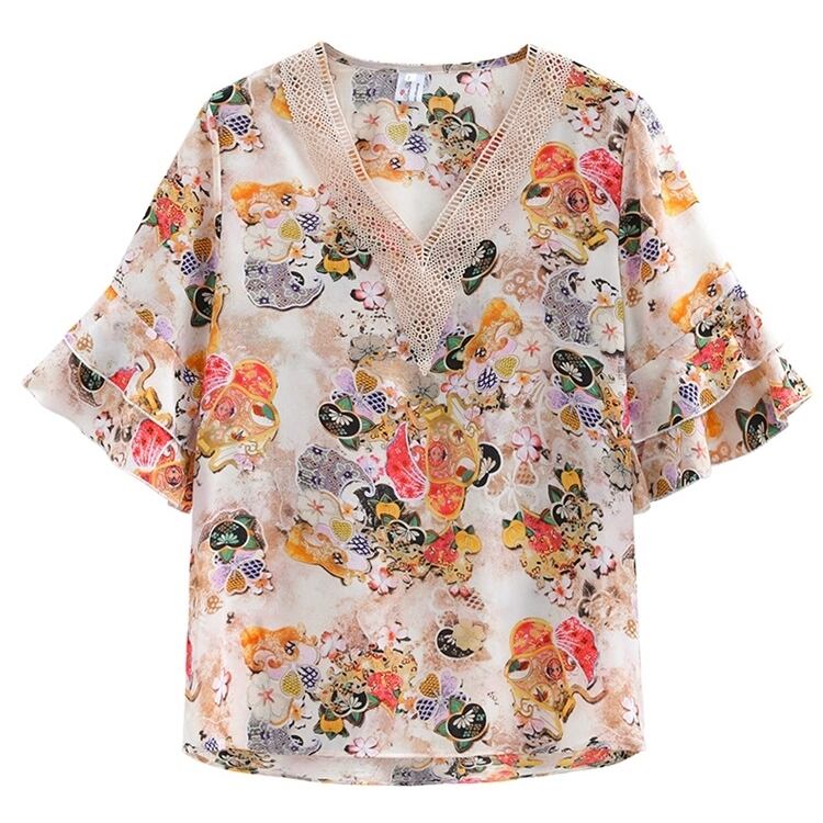 和柄調のフラワープリントが鮮やかなブラウス。