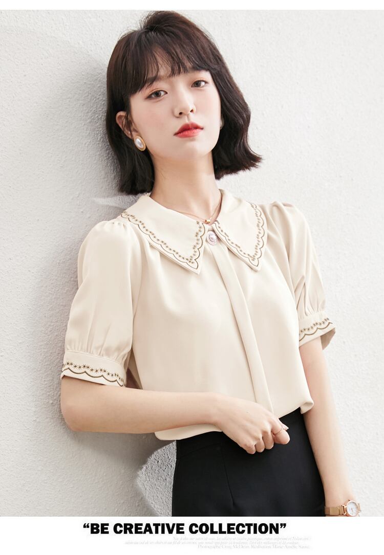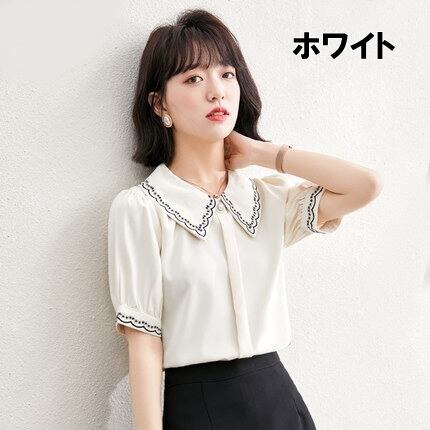 大きな襟とパールボタンがレトロでフェミニンなブラウスです。