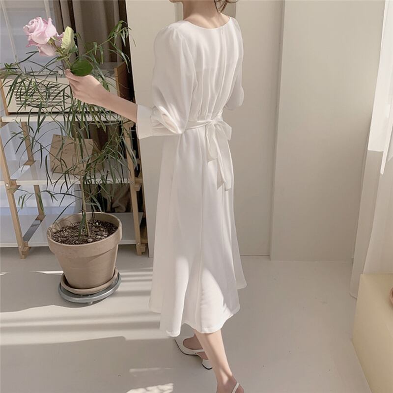 ワンピース レディース 送料無料 2色 マーメイドワンピース フレアワンピース 七分袖 パフスリーブ ハイウエスト ミモレ丈 ブルー ホワイト おしゃれ ロマンチック ガーリー キュート かわいい こなれ感 スタイル 小顔見せ 着痩せ 体形カバー インスタ トレンド きれいめ エレガント お呼ばれ パーティー 結婚式 二次会 イベント フォーマル フレア 大人かわいい 上品 シンプル パステルカラー 清楚 フェミニン お嬢様 バックリボン フレアライン マーメイドライン カジュアルドレス