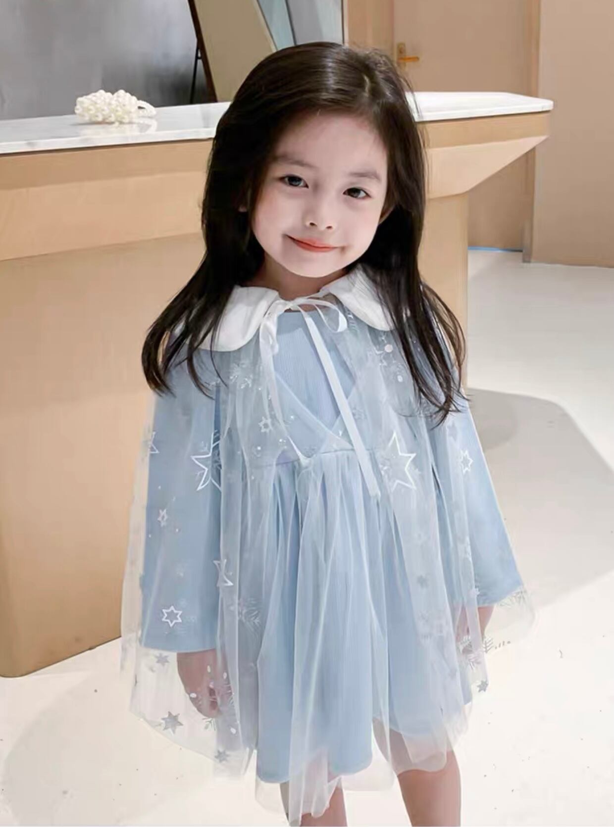 子供服 80〜130 レース シースルー ミディ丈ドレス 丸襟 星柄 リボン 送料無料 チュール ワンピース 子供 キッズコーデ キッズファッション キッズドレス キッズ 可愛い きれいめ エレガント 春 冬 秋 ガーリー お出かけ 外出 きれいめカジュアル 着回し ファッション デート コーディネート 重ね着 休日 特別な日 お祝い 記念日 カジュアル 普段着 春コーデ 冬コーデ 秋コーデ 韓国 おしゃれ シンプル ゆったり 韓国ファッション ワンポイント コーデ パーティー パーティドレス 誕生日