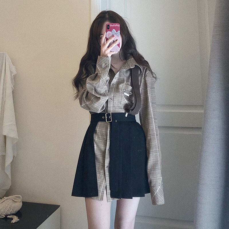 トレンド チェックシャツ+スカート セットアップ ミニ ミニ丈 袖あり 長袖 襟付き フレア 2点セット お得 かわいい カジュアル おしゃれ お洒落 かっこいい ラブリー キュート ガーリー 個性的 茶色 ブラウン 秋 冬 チェック柄 20代 10代 学生 通学 デート 女子会 休日 お出かけ 着回し 普段使い 重ね着 韓国 韓国系 オルチャン コーデ 美脚 脚長 トレンド 流行