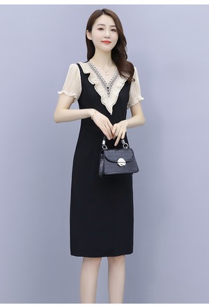 Vネックとレース襟のブラックとのコントラストがシックな一着。