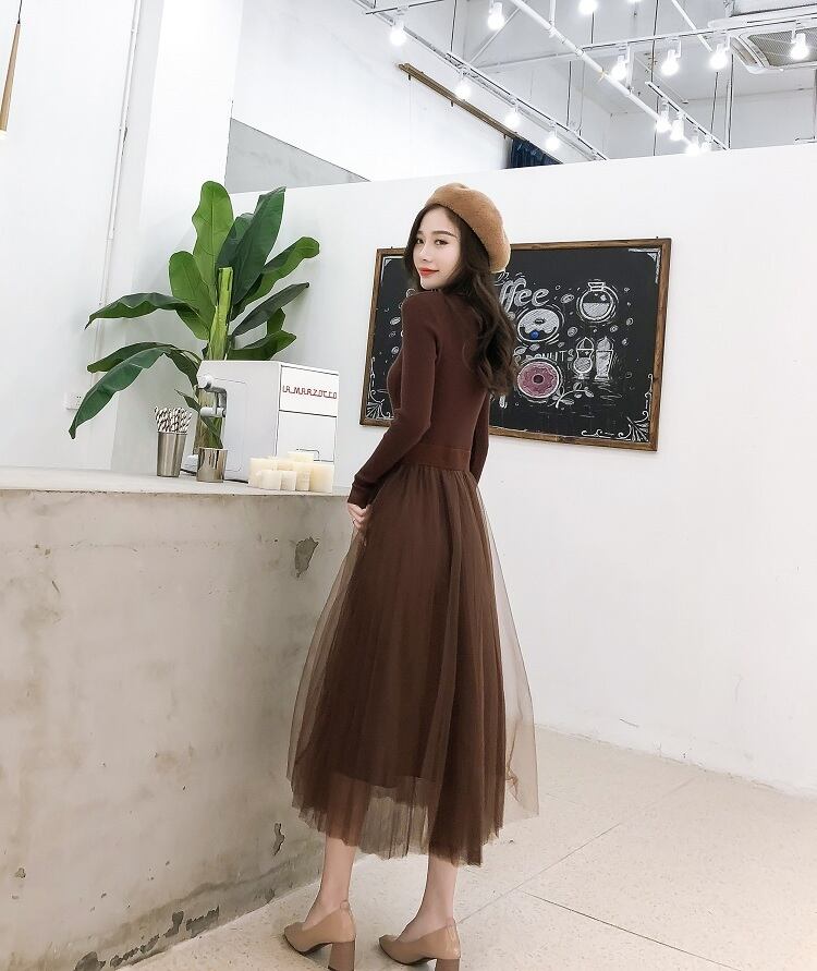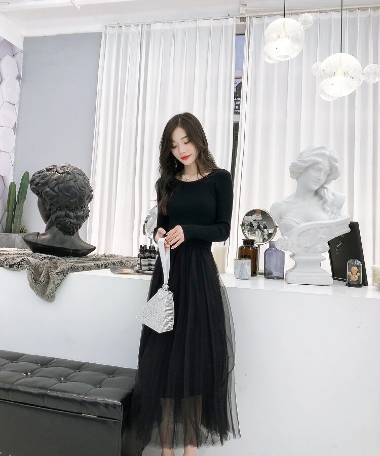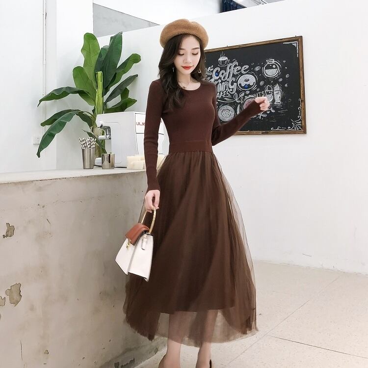 タイトなリブニットとウエストゴムの快適なスカートのドッキングワンピ。