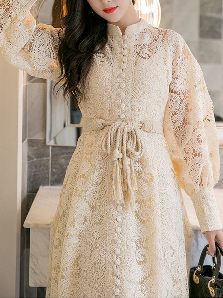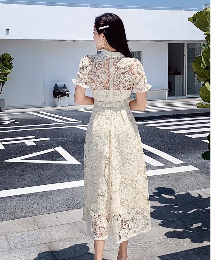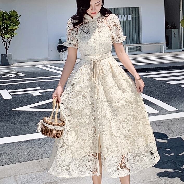 ワンピース ミディアム丈 送料無料 2種 フレアワンピース パンチングレース クロシェ編み レース クルミボタン スタンドカラー シアー シースルー 半袖 袖あり パフスリーブ 袖あり スクエアネック Aライン かわいい 大人可愛い 大人 上品 おしゃれ お洒落 大人可愛い 大人女子 ラブリー キュート ガーリー 主役級 存在感 とろみ感 オフホワイト ベージュ 無地 春 夏 10代 20代 30代学生 デート お出かけ 女子会 休日 パーティー イベント リゾート トレンド 流行