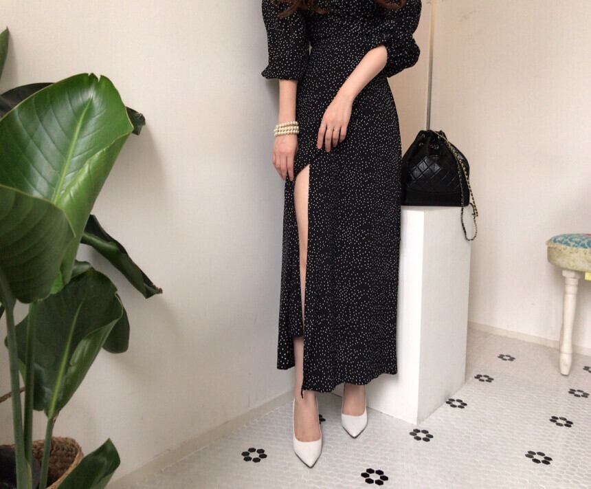ボリューミーなスリーブとタイトなラインのバランスがお洒落なワンピースです。スリットで軽やかに。