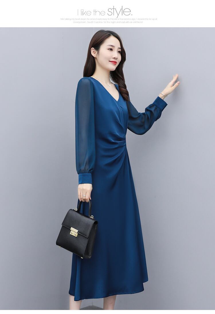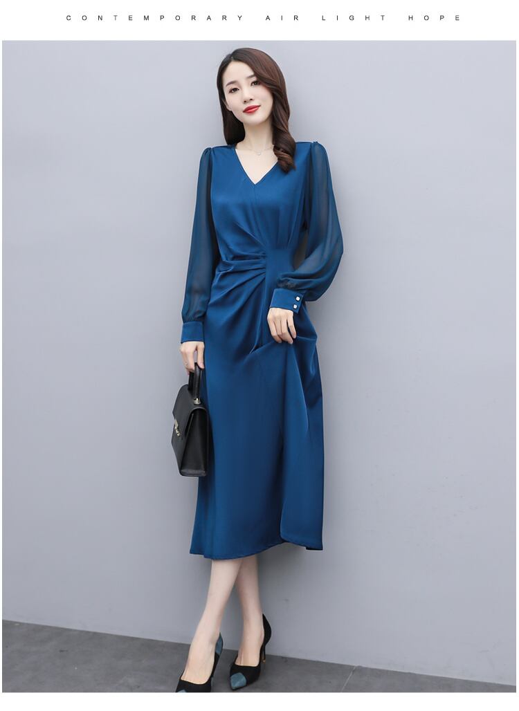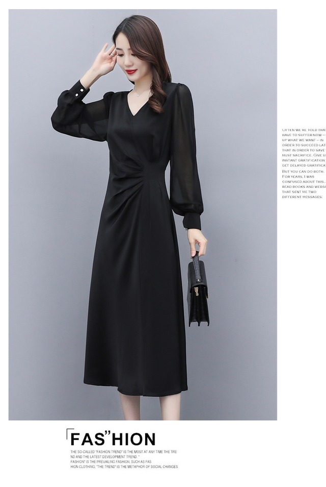 すっきりとしたVネックとウエストのポイントで洗練された印象に。