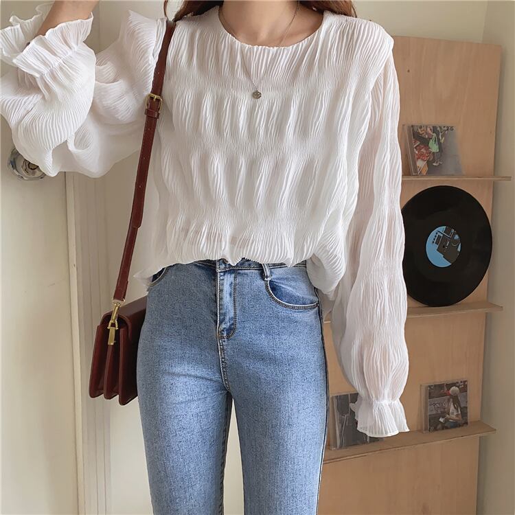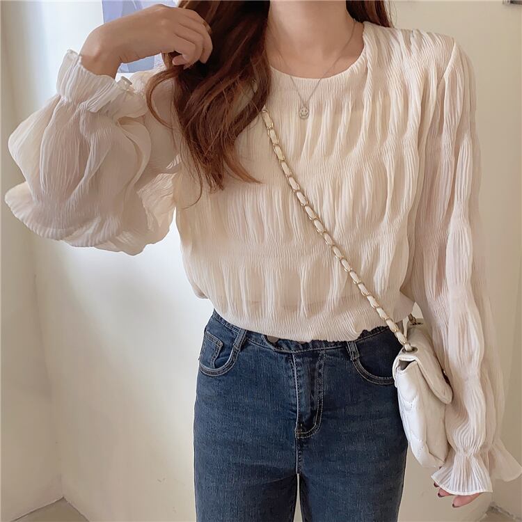 トップス レディース 送料無料 4色 ブラウス シャツ クルーネック フリル プリーツ ギャザー しわ加工 長袖 襟なし シフォン 花柄 レース シアー シースルー ポリエステル ホワイト 白 ピンク アプリコット 単色 透け感 こなれ感 抜け感 ガーリー かわいい 可愛い 涼し 通気性 キュート 上品 エレガント きれいめ ラブリー 女の子 お洒落 おしゃれ 春 春服 夏 夏服 10代 20代 デート おでかけ モテ 女子会 普段使い 着回し 重ね着 定番 2021 韓国 韓国系 オルチャン