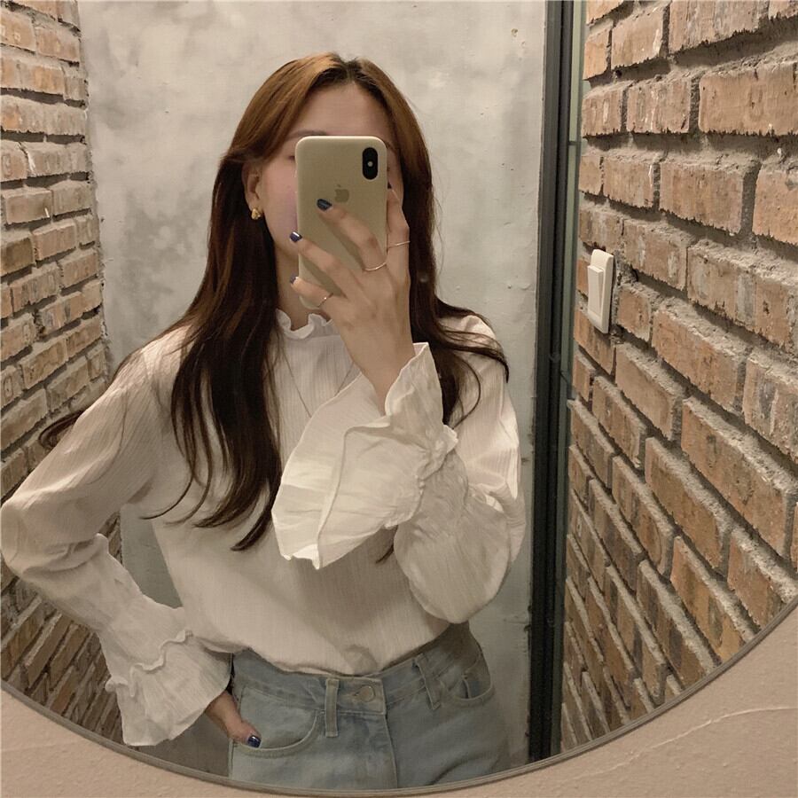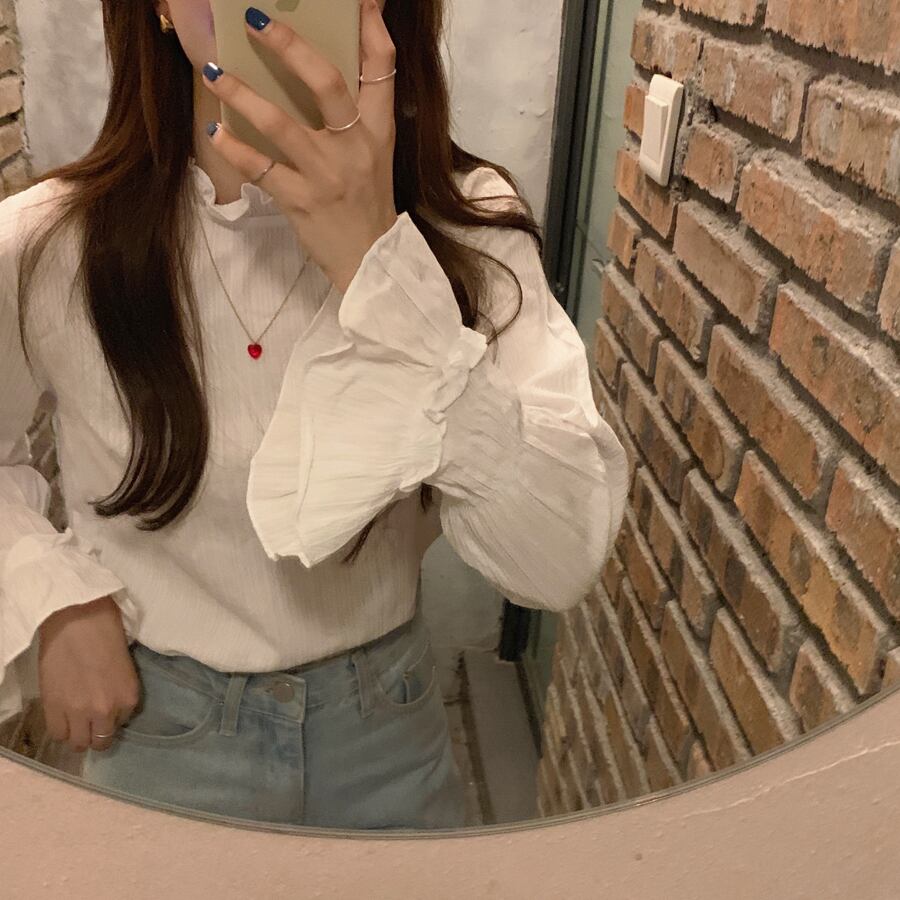 トップス レディース 送料無料 ブラウス シャツ ハイネック フリル襟 長袖 キャンディースリーブ トランペットスリーブ 襟なし シフォン 花柄 レース シアー シースルー ポリエステル ホワイト 白 ピンク アプリコット 単色 透け感 こなれ感 抜け感 ガーリー かわいい 可愛い 涼し 通気性 キュート 上品 エレガント きれいめ ラブリー 女の子 お洒落 おしゃれ 春 春服 夏 夏服 10代 20代 デート おでかけ モテ 女子会 普段使い 着回し 重ね着 定番 2021 韓国 韓国系 オルチャン
