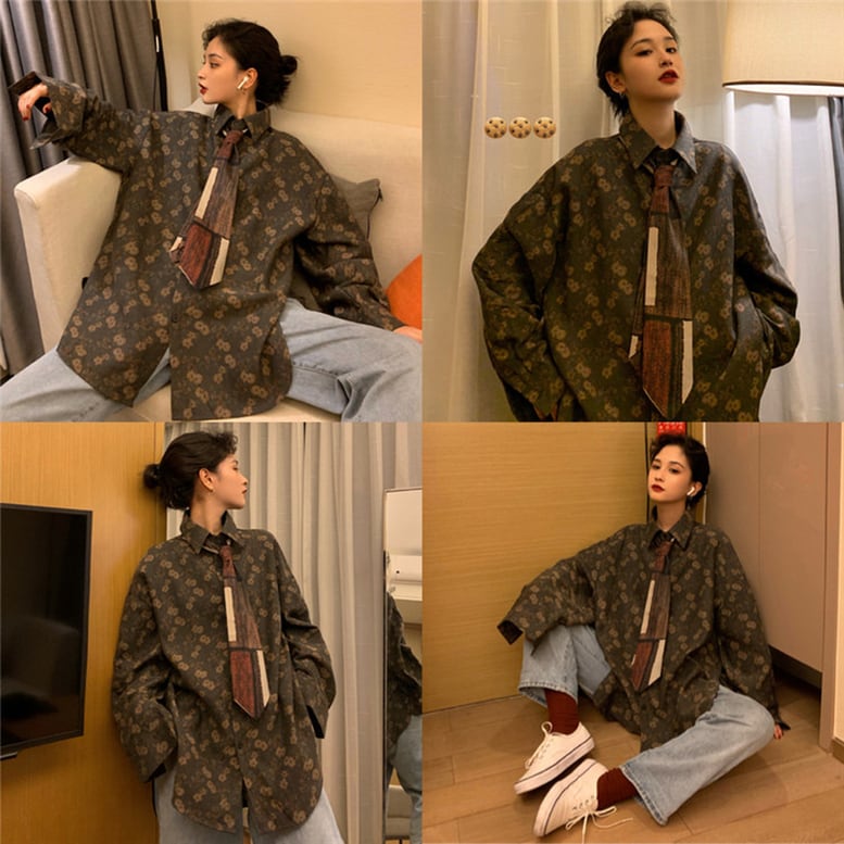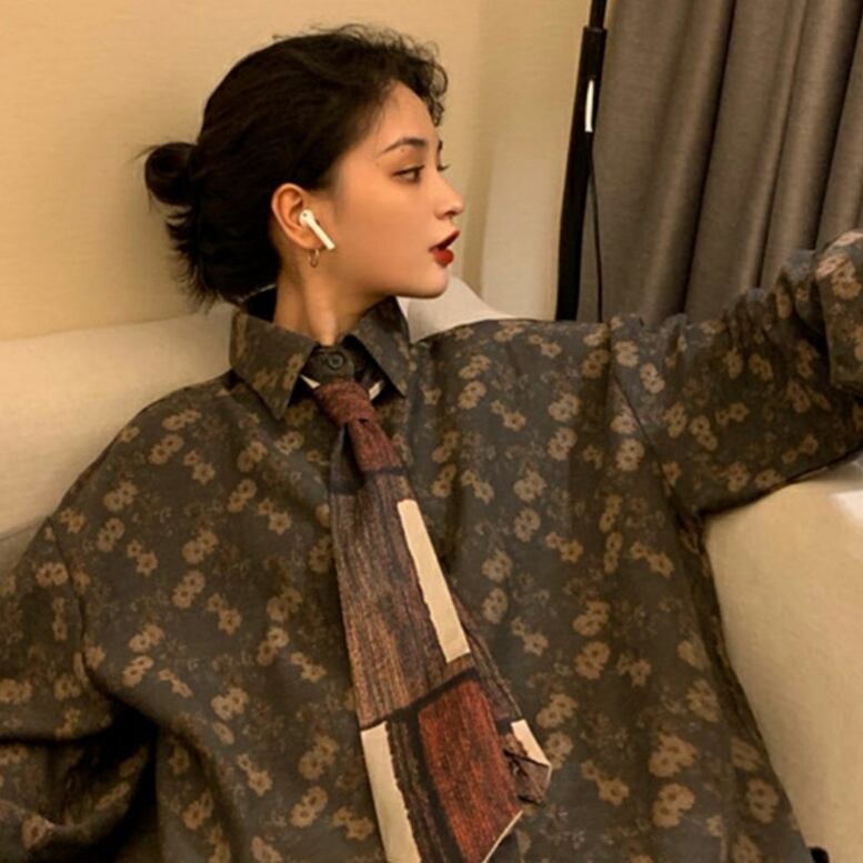 ビッグシャツ レディース 送料無料 ボウタイブラウス ネクタイ付き花柄オーバーシャツ トップス シャツ ブラウス 長袖 襟付き オーバーサイズ ビッグシルエット きれいめ 上品 レトロ 大人女子 こなれ感 マニッシュ キュート ガーリー エレガント ゆったり ブラウン 花柄 フラワー ボタニカル ボヘミアン 重ね着 楽ちん 体型カバー 高見え 春夏 秋冬 大人 かわいい おしゃれ 普段使い デイリー お呼ばれ お出かけ
