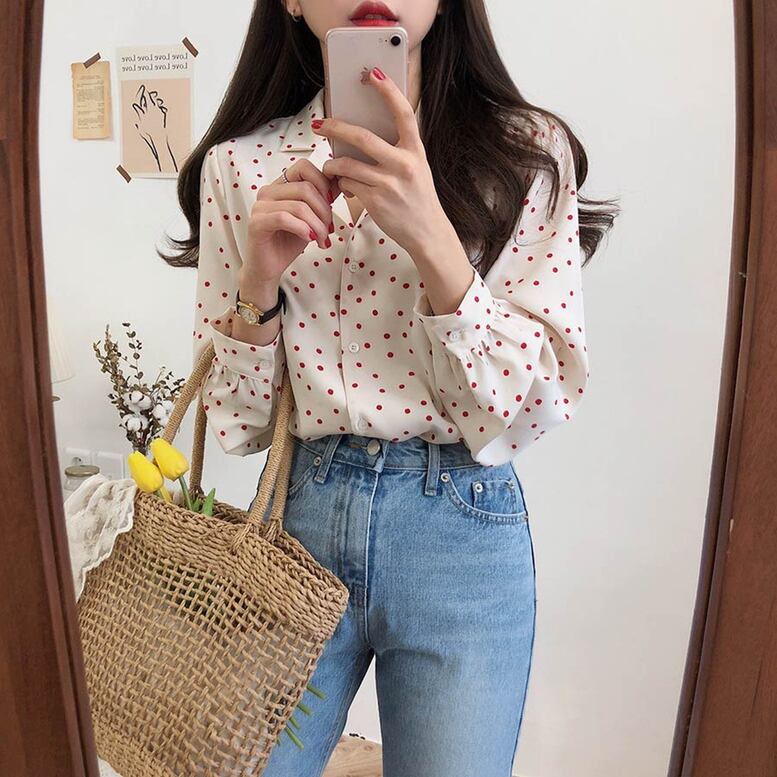 ドット開襟シャツ レディース 送料無料 オープンカラードットシャツ ランダムドットブラウス ドット柄開襟ブラウス トップス 長袖 襟付き 大人可愛い きれいめ 上品 レトロ キュート ガーリー エレガント 抜け感 ドット柄 プリント 重ね着 定番 インスタ映え 春夏 秋冬 大人 かわいい おしゃれ 普段使い デイリー お呼ばれ お出かけ デート オフィス 通勤 通学 旅行 パーティー 二次会 トレンド