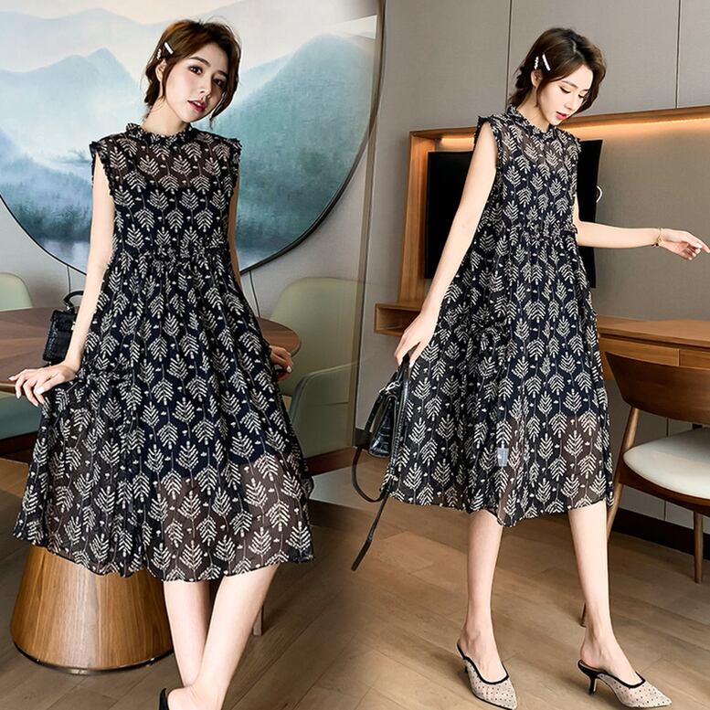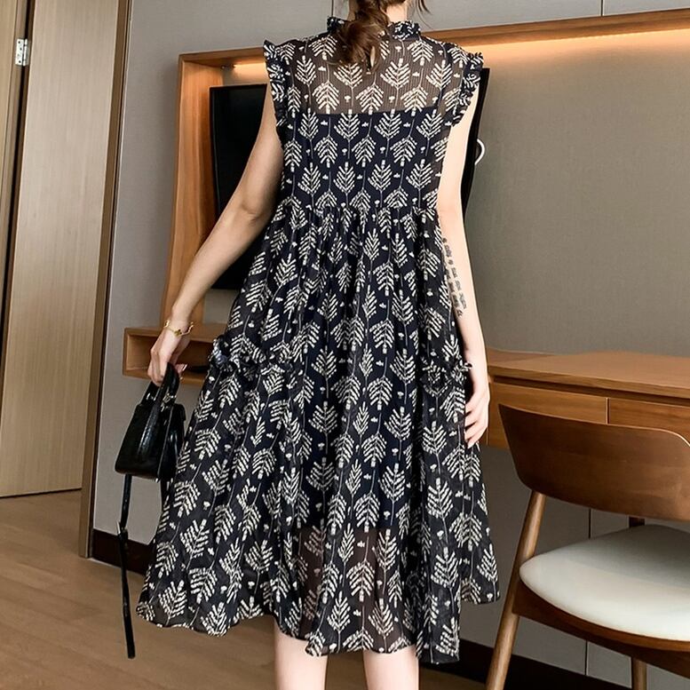 ワンピースセット レディース 送料無料 シフォンワンピース+インナーキャミワンピ2点セット インナー付きシアーワンピースドレス リーフ柄フレアワンピース ワンピース ドレス dress フレアワンピース ひざ下 ロング 袖なし ノースリーブ ハイネック スタンドカラー 透け感 シースルー エレガント 大人可愛い きれいめ ナチュラル 華やか レトロ キュート ガーリー 黒 ブラック 花柄 ボタニカル ボヘミアン 高見え インスタ映え