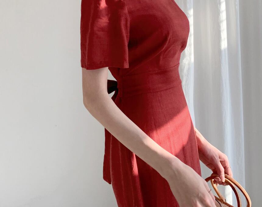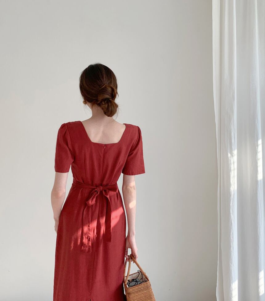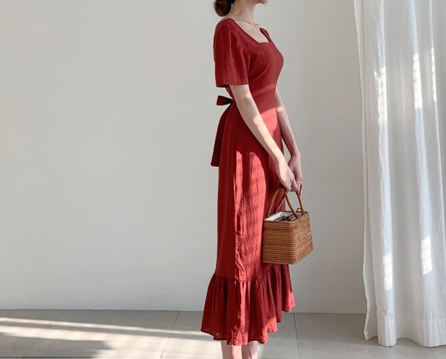 ニュアンスのある生地で仕立てたスクエアネックのフィッシュテールワンピース。