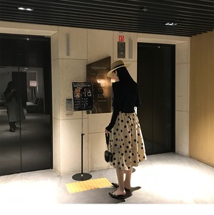 ブラックカーディガン風トップスとドットのティアードスカートセット。