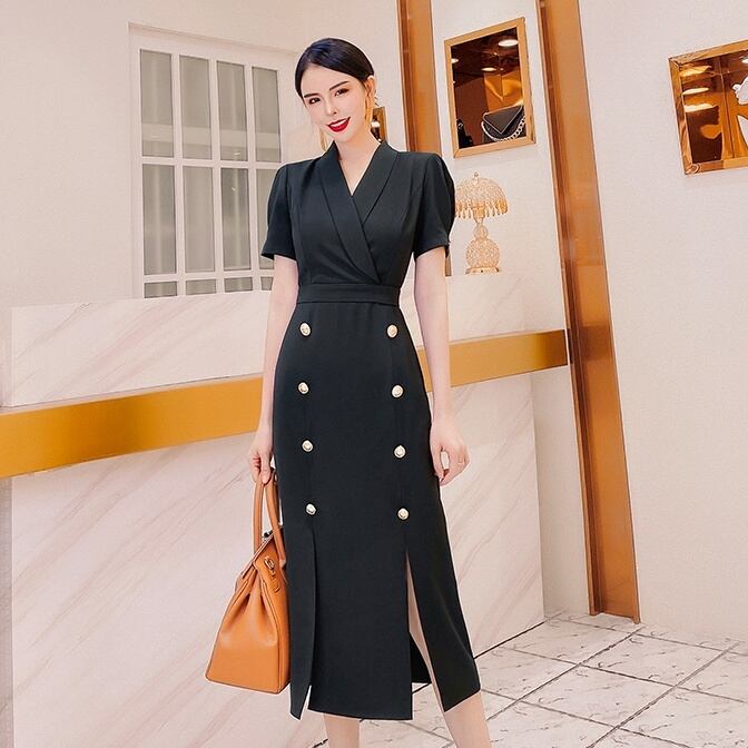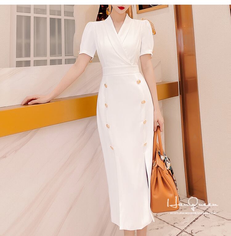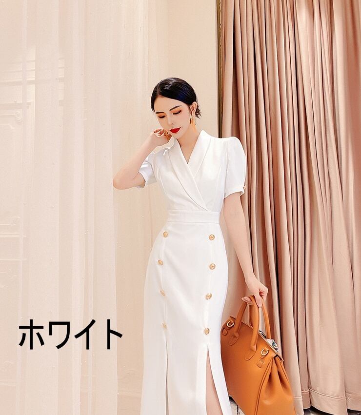 パーティードレス 二次会 結婚式 ワンピース ゴールドボタン 袖あり 半袖 Vネック スリム タイト 細身 ストレート サイドスリット 大人 上品 おしゃれ お洒落 かっこいい 大人可愛い 大人女子 個性的 クール モード系 セクシー 主役級 存在感 白 ホワイト 黒 ブラック 20代 30代 40代 レディース パーティー イベント オフィス ビジネス OL 通勤 着回し 普段使い 重ね着 韓国 韓国系 オルチャン コーデ スタイル 美脚 脚長 トレンド 流行