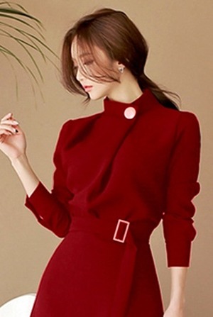 パーティードレス 二次会 結婚式 ワンピース 袖あり 長袖 膝丈 ひざ丈 襟付き スタンドカラー フレア ウエストマーク 赤 レッド 無地 秋 冬 10代 20代 30代 40代 レディース 休日 パーティー イベント 韓国 韓国系 オルチャン ファッション コーデ スタイル モテ トレンド 流行 秋カラー