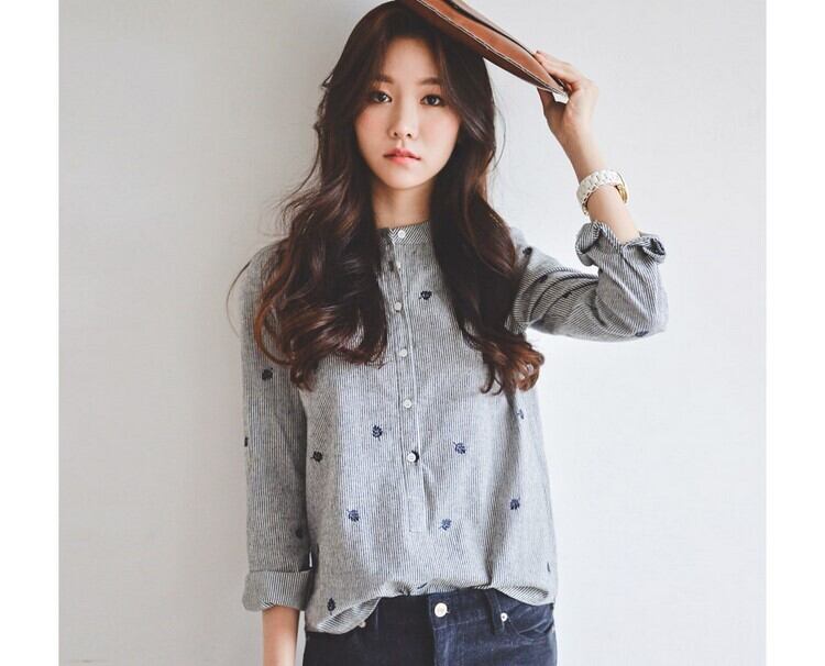 ブラウス シャツ オシャレ スカート 長袖 襟付き スタンドカラー かわいい 大人可愛い シンプル カジュアル 上品 おしゃれ お洒落 大人女子 こなれ感 ラフ メンズライク マニッシュ ボーイッシュ 個性的 灰色 グレー ストライプ 春 夏 秋 10代 20代 30代 40代 50代 レディース オフィス ビジネス OL 通勤 学生 通学 お出かけ 着回し 普段使い 重ね着 韓国 韓国系 オルチャン ファッション コーデ スタイル