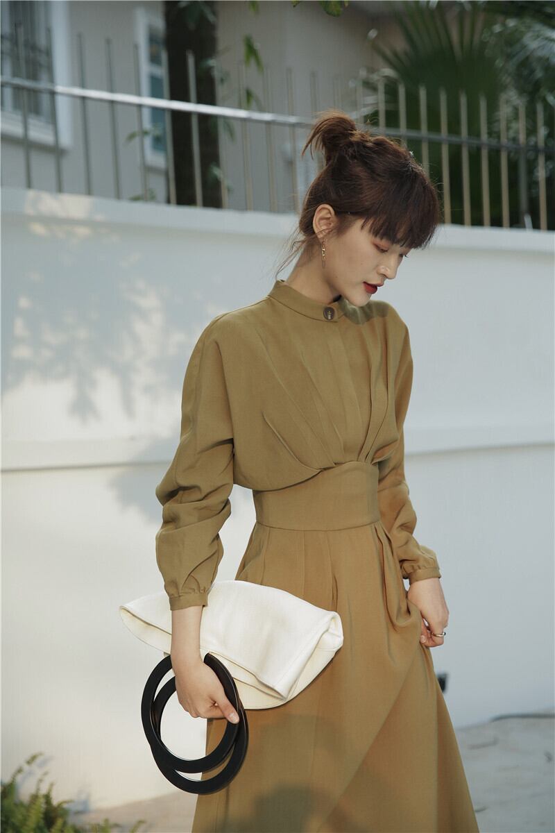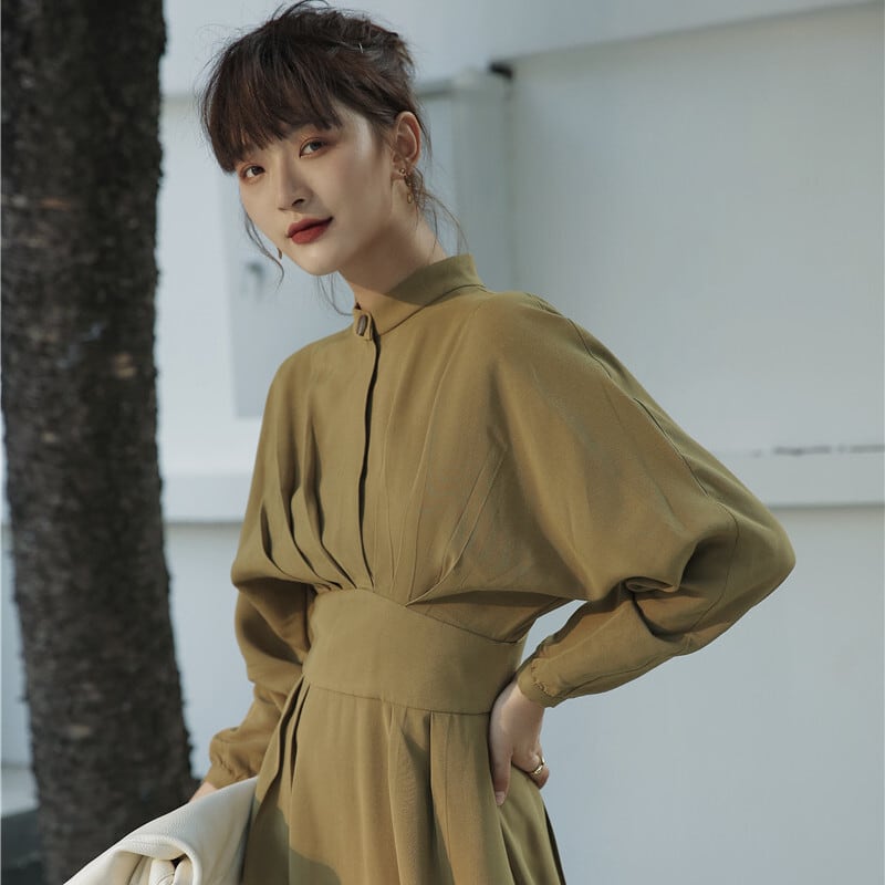ワンピース レディース 送料無料 タッキングワンピース シャツワンピース フレアワンピース クラシカル 長袖 ボリュームスリーブ ハイウエスト ミモレ丈 カーキ ベージュ モード クール モダン レトロ カフェ おしゃれ ロマンチック ガーリー キュート ドレープ かわいい こなれ感 スタイル 小顔見せ 着痩せ 体形カバー インスタ トレンド きれいめ エレガント タッキング フレア 大人かわいい 上品 リゾート 旅行 ポリエステル ふんわり パフスリーブ デート お出かけ カジュアルドレス