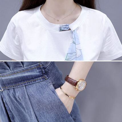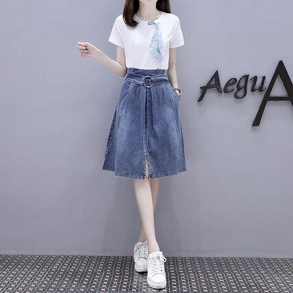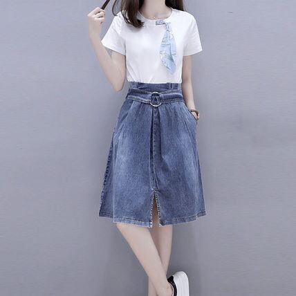 スカーフモチーフのカジュアルなTシャツとデニムスカートのセットアップ。