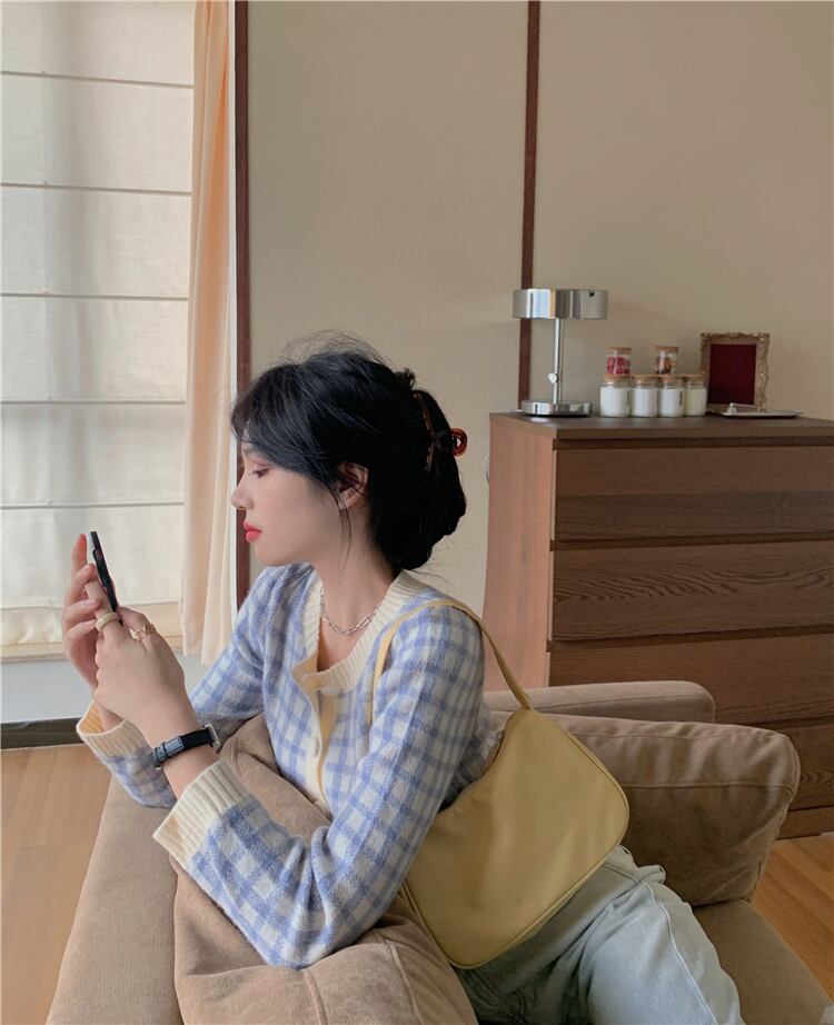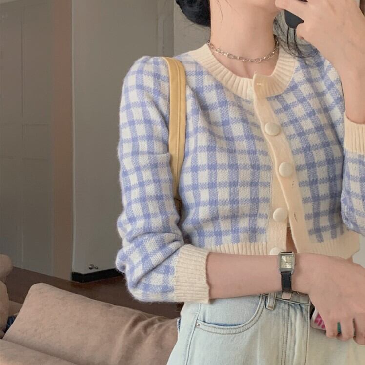 トップス アウター カーディガン レディース 送料無料 ショート丈 長袖 前開き ニット かわいい 大人可愛い きれいめ シンプル 上品 おしゃれ アジアン 大人女子 こなれ感 ラフ ラブリー キュート ガーリー エレガント モダン フリーサイズ 青 ブルー ピンク オレンジ チェック柄 格子柄 グレンチェック 春 秋 冬 10代 20代 オフィス ビジネス OL 通勤 デート お出かけ 女子会 休日 イベント 旅行 着回し 普段使い 重ね着 韓国系 オルチャン 楽ちん 防寒 体系カバー インスタ映え